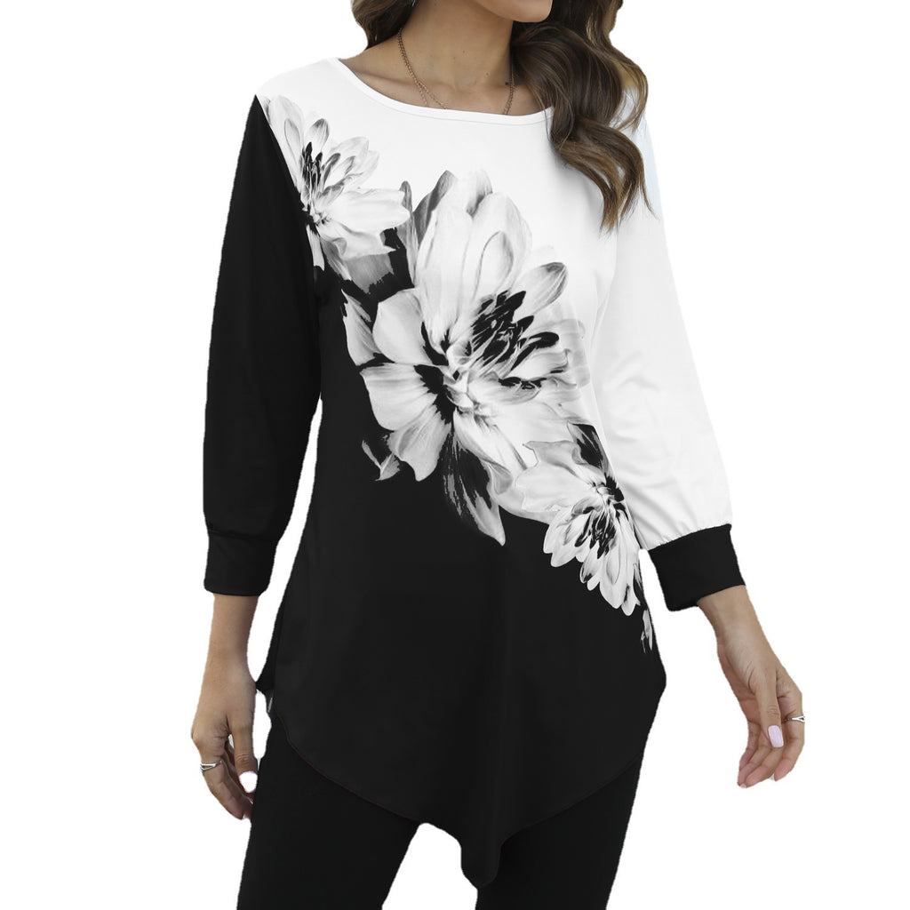 خذ مصدر إلهام أسلوبك من الجمال الطبيعي للطبيعة مع قميص طباعة الأزهار الطويلة الأكمام الطويلة للسيدات التي تتميز بزهرة كبيرة في وسط كتل الألوان المنقسمة قطريًا.