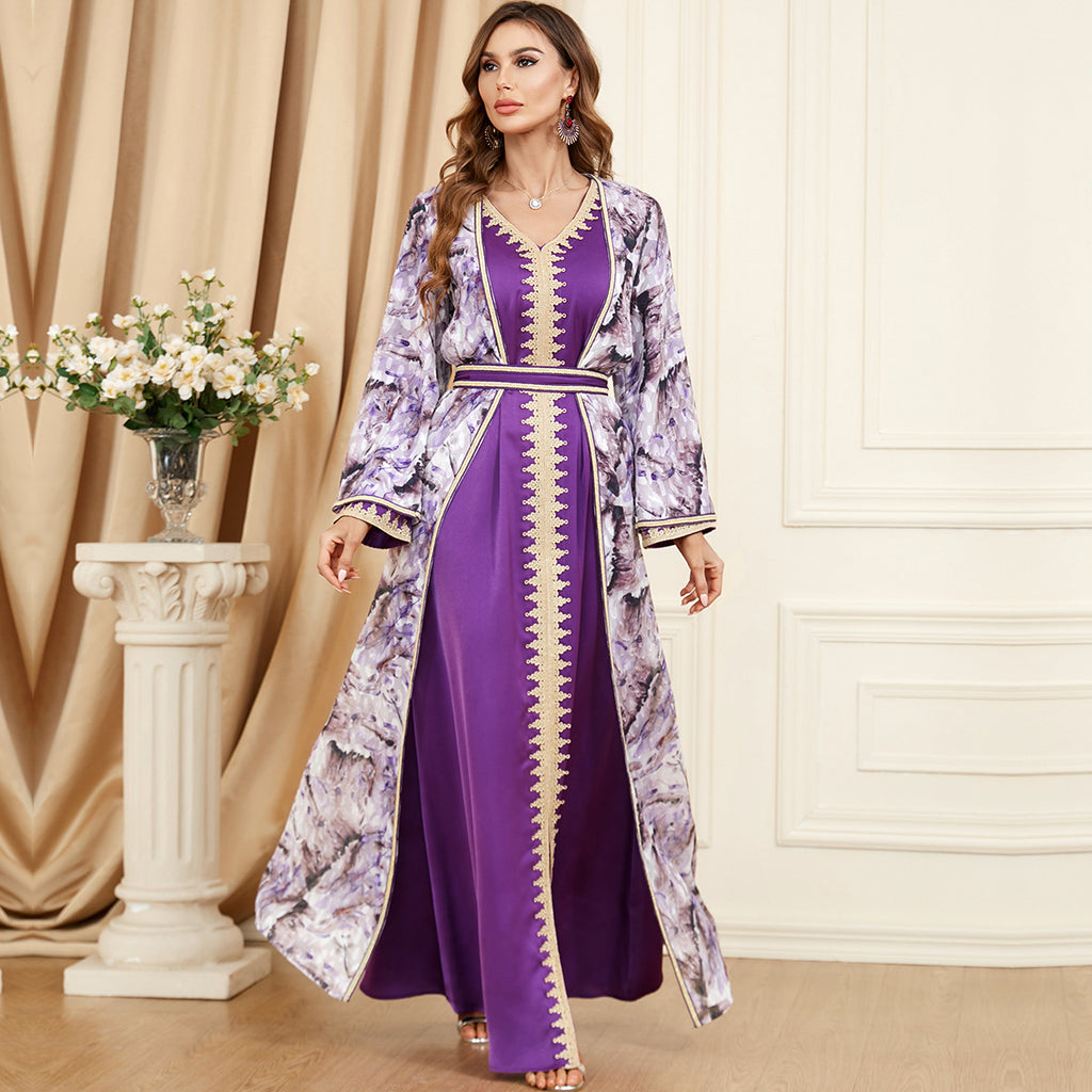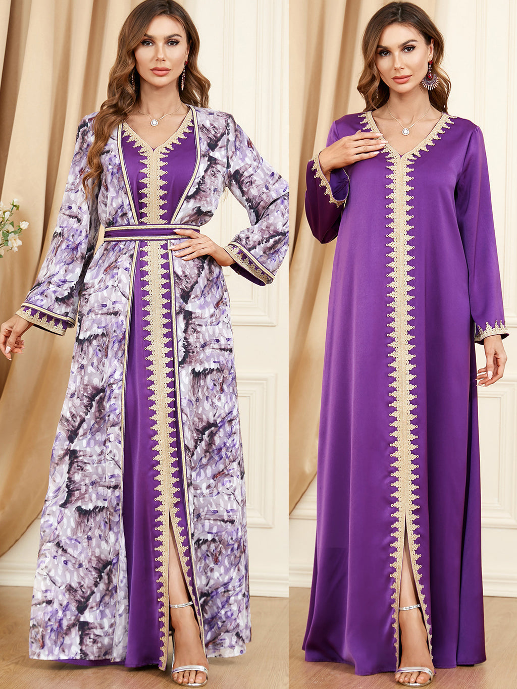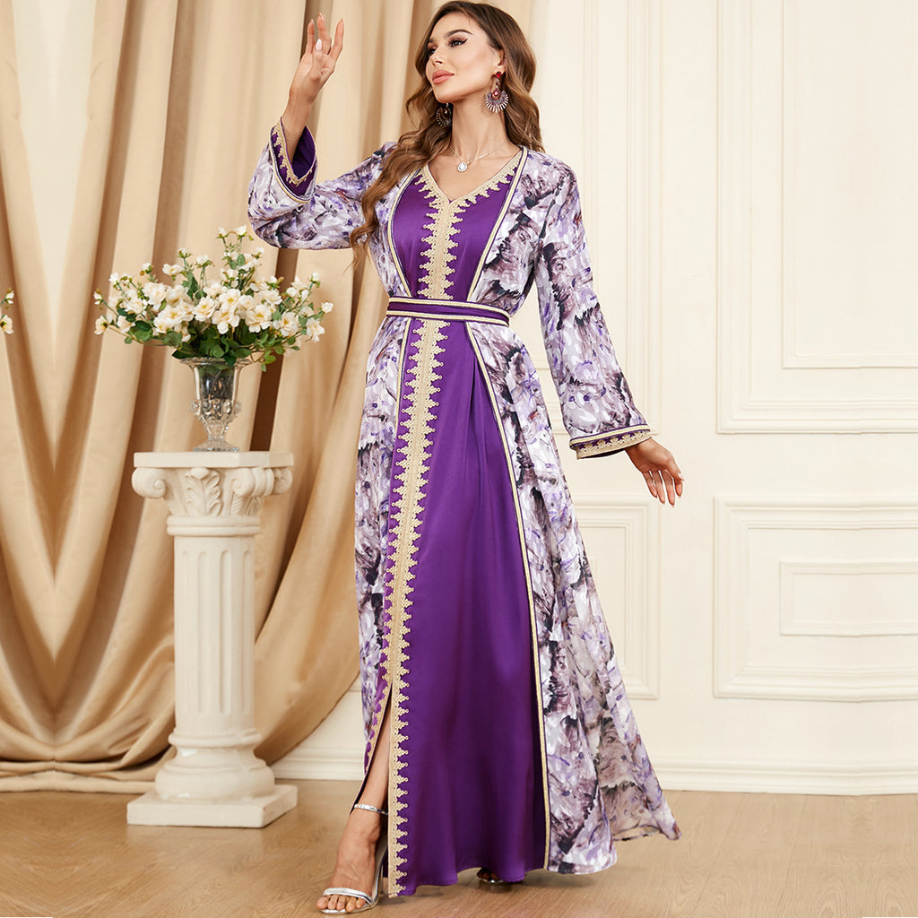 Women's Long Sleeve Purple Maxi Dress with Golden Trim