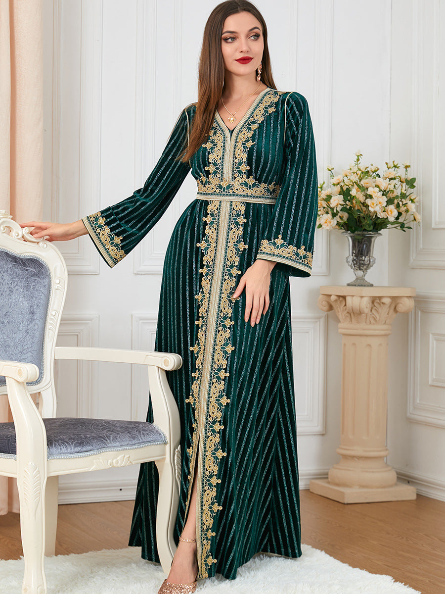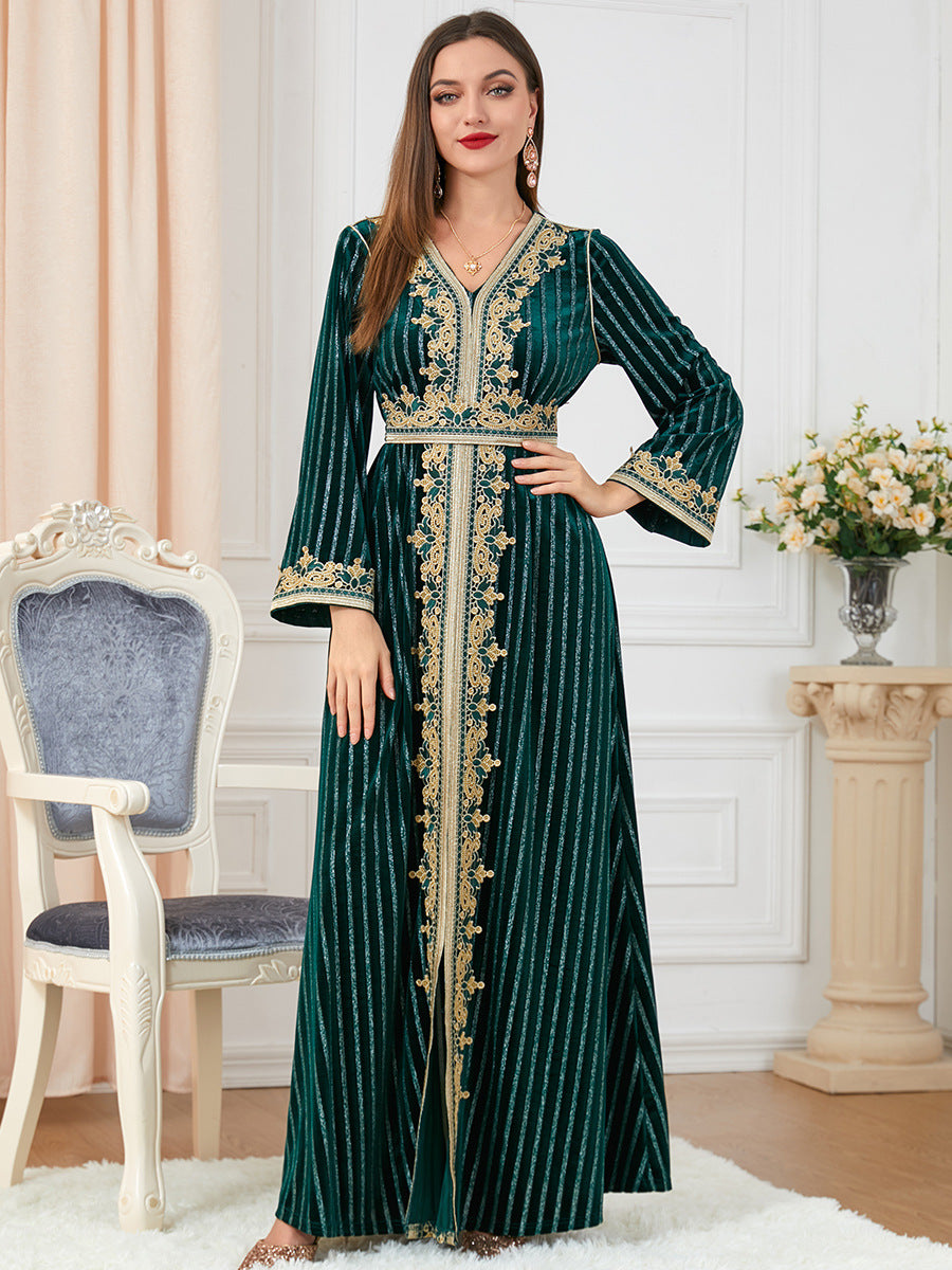 Express yourself in the Women's Long Sleeve Vertical Stripe Green Maxi Dress. It features golden-toned accents that match the trim on the sleeves.