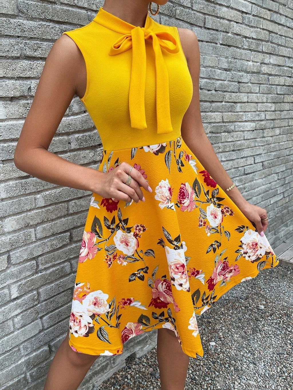 Ärmelloses Blumenkleid in A-Linie mit Schleifenkragen