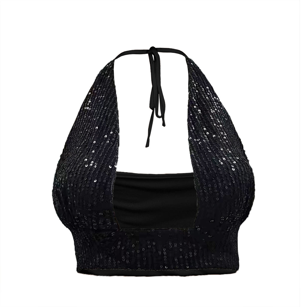 Beenden Sie jedes Sommer -Ensemble im ärmelloses Neckholder -Top der Frauen mit Pailletten. Dieses Top hat einen steilen Ausschnitt und kommt in der Wahl von Schwarz oder Weiß.