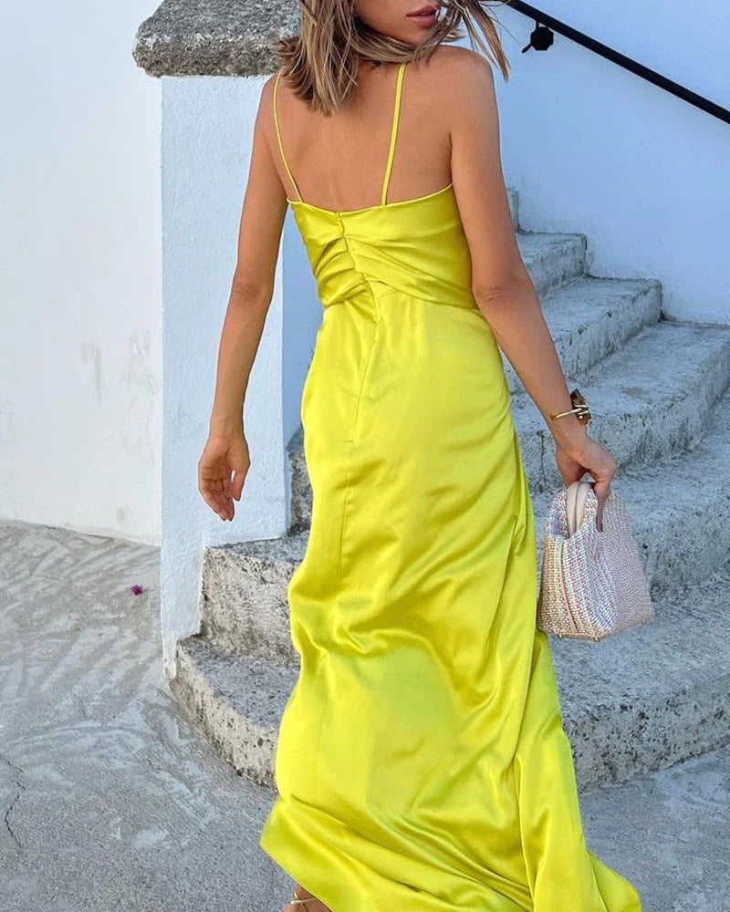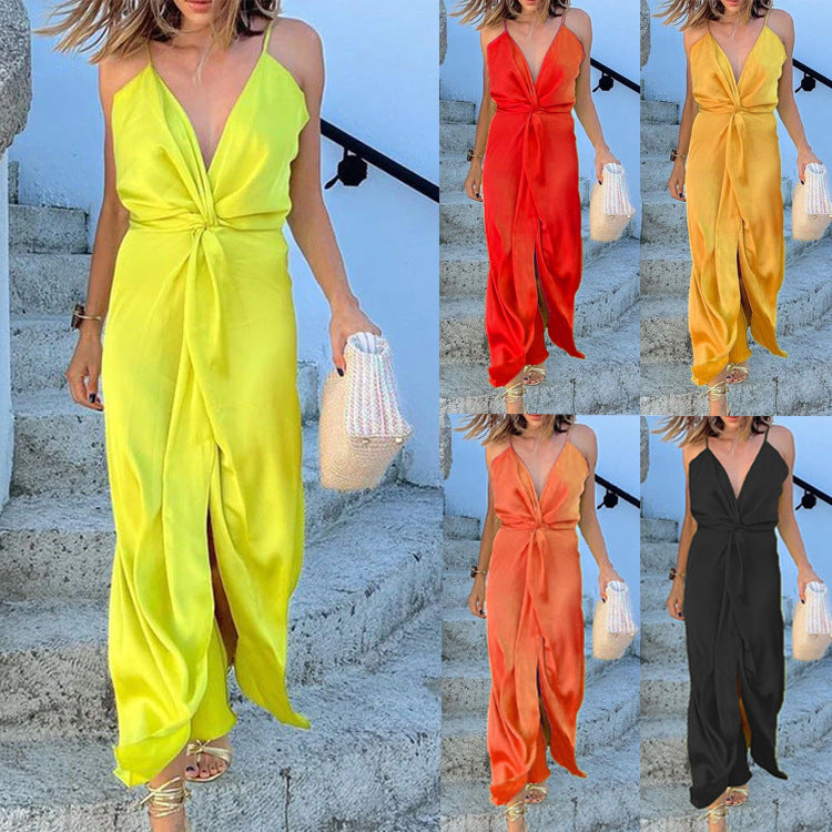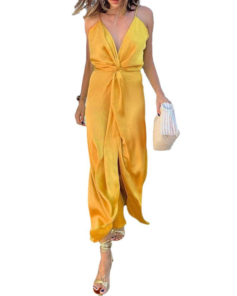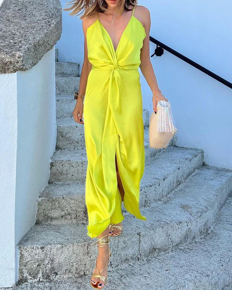 Setzen Sie ein Statement, wenn Sie den Raum mit dem ärmellosen Kleid mit niedrigem V-Ausschnitt für Frauen betreten. Das locker sitzende Kleid ist in leuchtenden Farben wie Gelb, Orange und Rot erhältlich.
