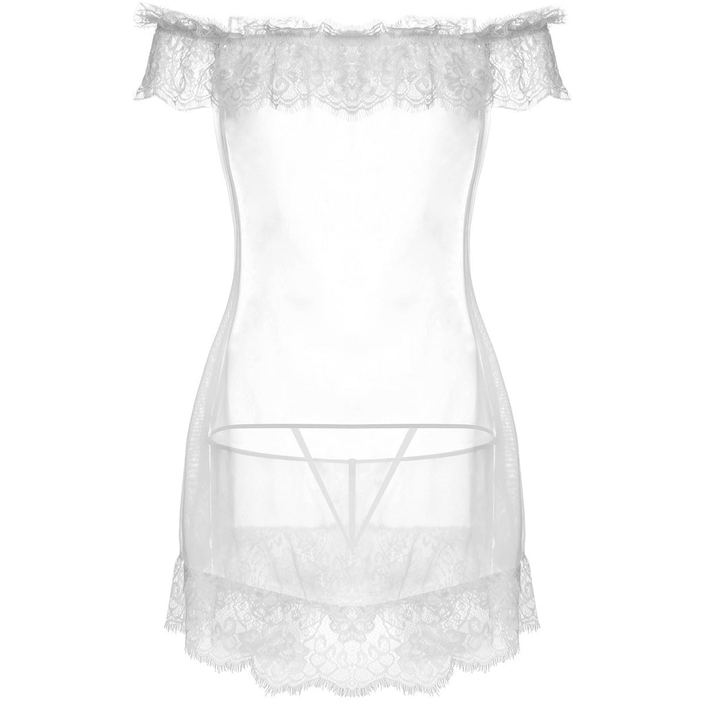 Die schulterfreien Spitzenärmel und der Spitzenbesatz des Off the Shoulder Lingerie Slip Dress sind durch eng anliegendes Mesh verbunden, das Ihrer Figur schmeichelt.