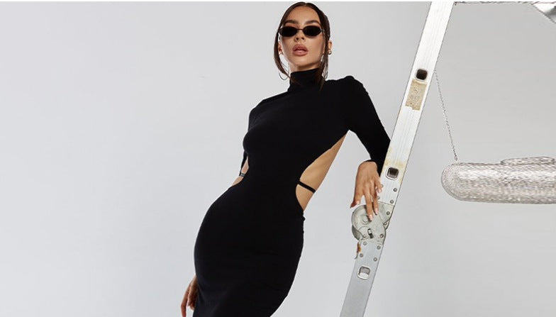 Dieses kokette und verführerische Damen-Midikleid mit Ausschnitten und langen Ärmeln wird Sie mit Sicherheit auffallen lassen. Es hat Ausschnitte entlang des Rückens und der Seite sowie einen Schlitz, der bis zum Oberschenkel verläuft.