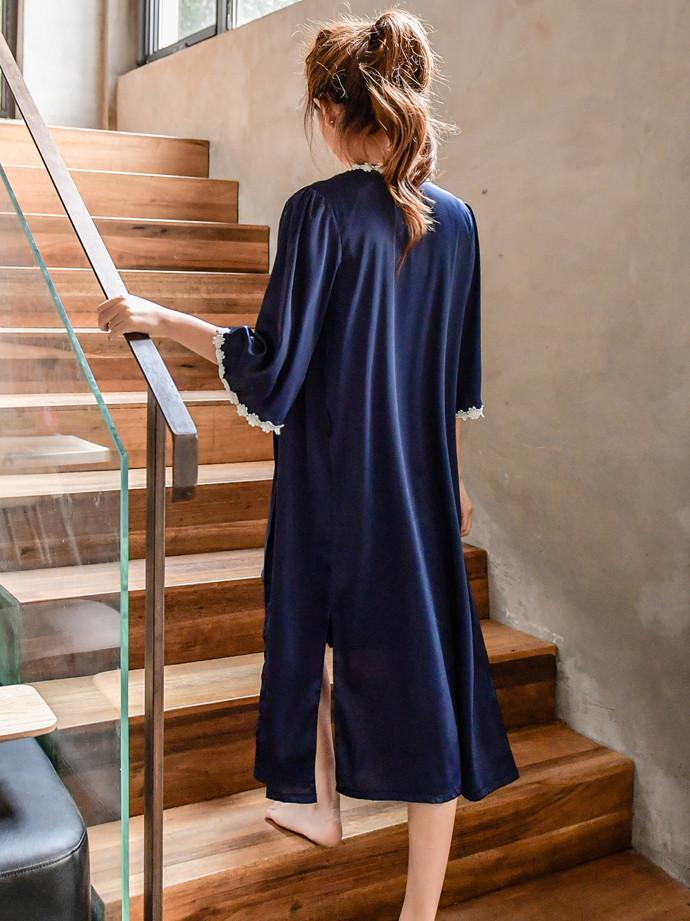 Aus einem seidigen Material gefertigt, das die Haut so sanft streichelt, und mit einem Spitzenbesatz versehen, erzeugt dieses Dessous-Nachtkleid einen ätherischen Effekt, der Sie metaphorisch zwischen den Himmeln herumtollen lässt. Es ist alles, was ein Mädchen braucht, um sich wohl zu fühlen und gleichzeitig süß auszusehen, und es wird mit einem passenden Bademantel für die Zeiten geliefert, in denen mehr Bedeckung benötigt wird.