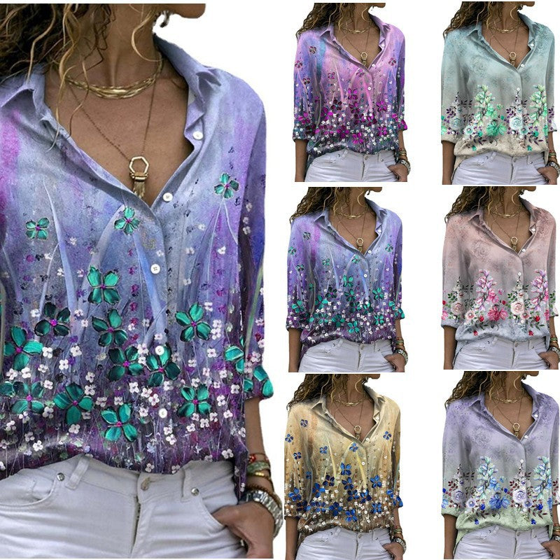 Perfekt für Frühling und Sommer, dieses langärmlige Button-Down-Damenoberteil mit Blumendruck ist ein auffälliges, luftiges Oberteil mit Blumendetails, die darüber verstreut sind. Es kommt in Ihrer Wahl der Farben.