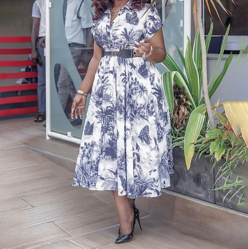 Botanisch gemustertes Kleid in A-Linie für Damen mit Kragen und kurzen Ärmeln