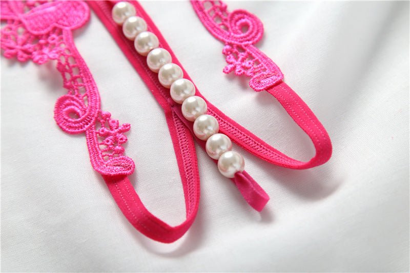 Fühlen Sie sich süß und feminin in diesen Tangas im Schmetterlingsstil mit hoher Taille und Perlendetail, die eine florale Spitzenfront und eine Perlenkette aufweisen, die den mittleren Ausschnitt hinunterläuft.