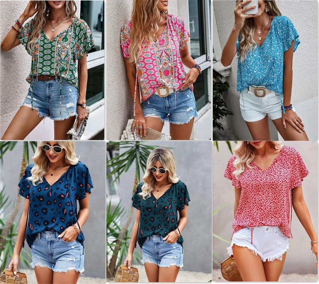 Drücken Sie sich in jeder Stimmung mit dem lebendigen und farbenfrohen Chic Patterned Kurzarm-Top im Boho-Chic-Stil mit Ihrer Auswahl an Mustern aus. Die lockere Passform ist bequem und vielseitig, wie Sie es tragen können.