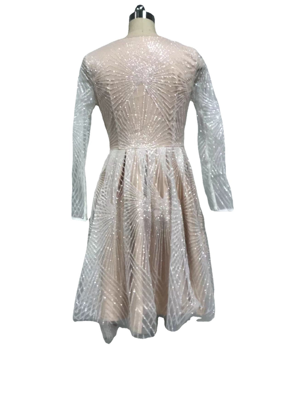 Das Damen-Cocktailkleid mit V-Ausschnitt, Mesh-Ärmeln und Midi-Saum ist ein vielseitiges und klassisches Cocktailkleid, das knapp über dem Knie sitzt. Es kommt in Ihrer Wahl der Farben, um Ihrem spezifischen Geschmack zu entsprechen.