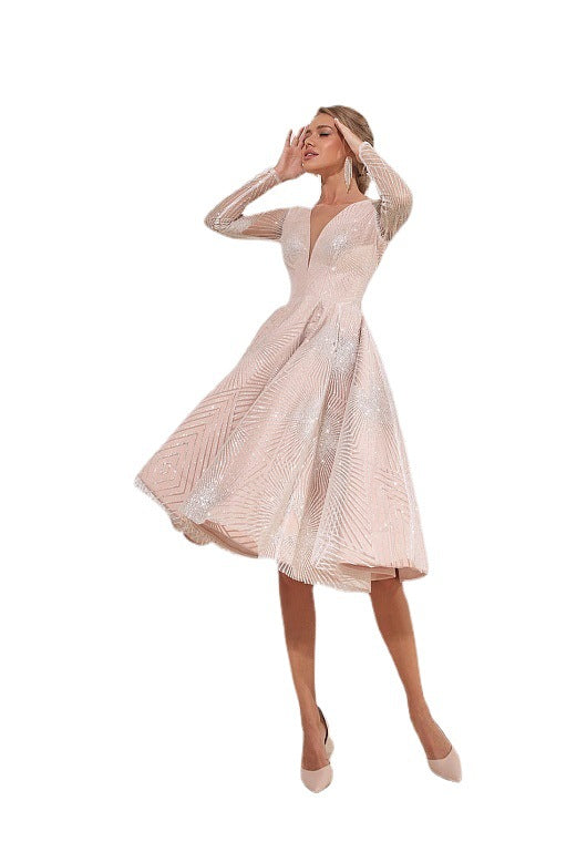 Cocktailkleid mit V-Ausschnitt, Mesh-Ärmeln und Midi-Saum