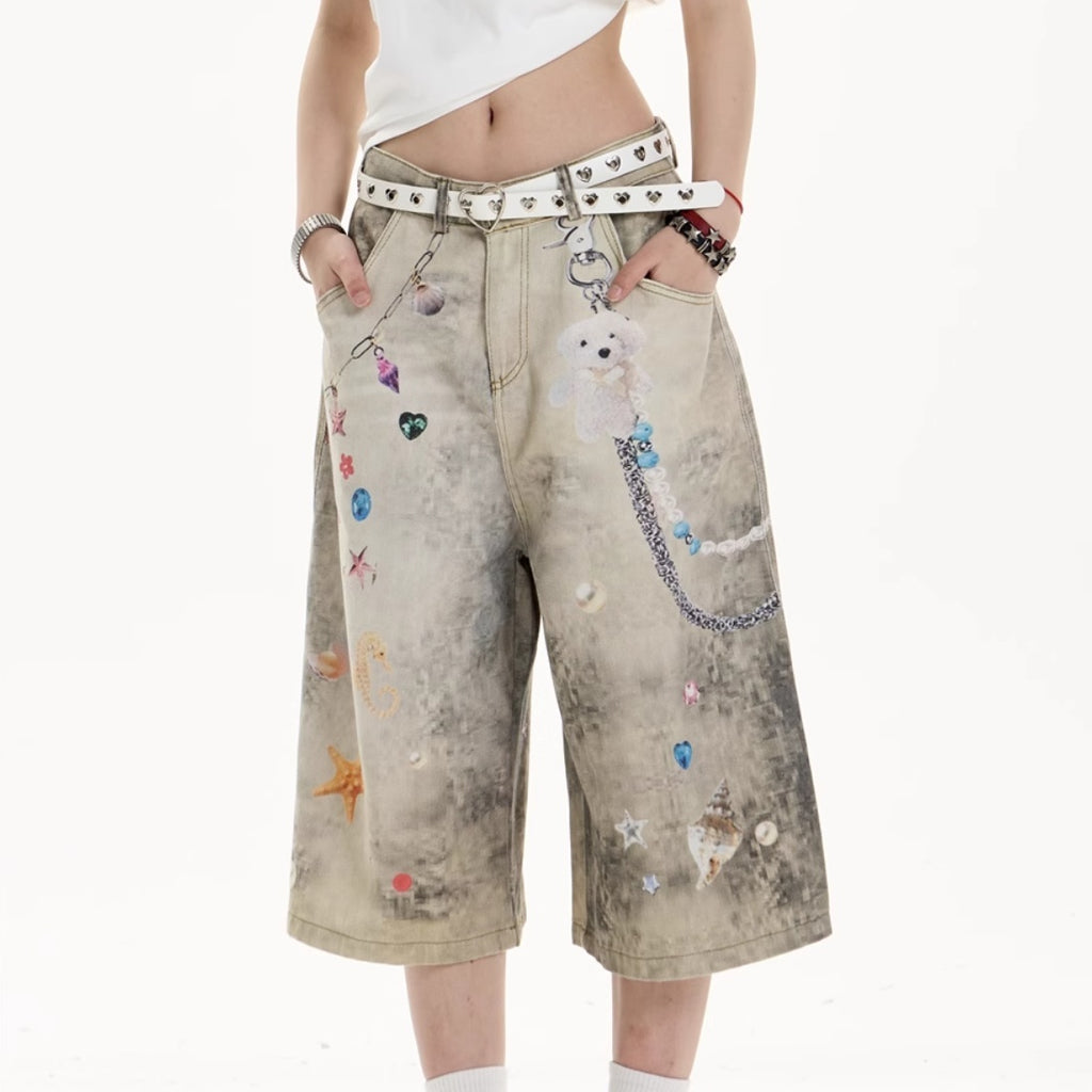 Lassen Sie Ihren Denim mit diesen verkürzten Weitbein-Jeans mit künstlerischen All-Over-Drucken hervorheben. Die gerade, lockere Passform bringt Komfort, während die einzigartigen Muster Ihre Kreativität zeigen. Ideal für Übergangssaisonen oder spielerische Schichten.
