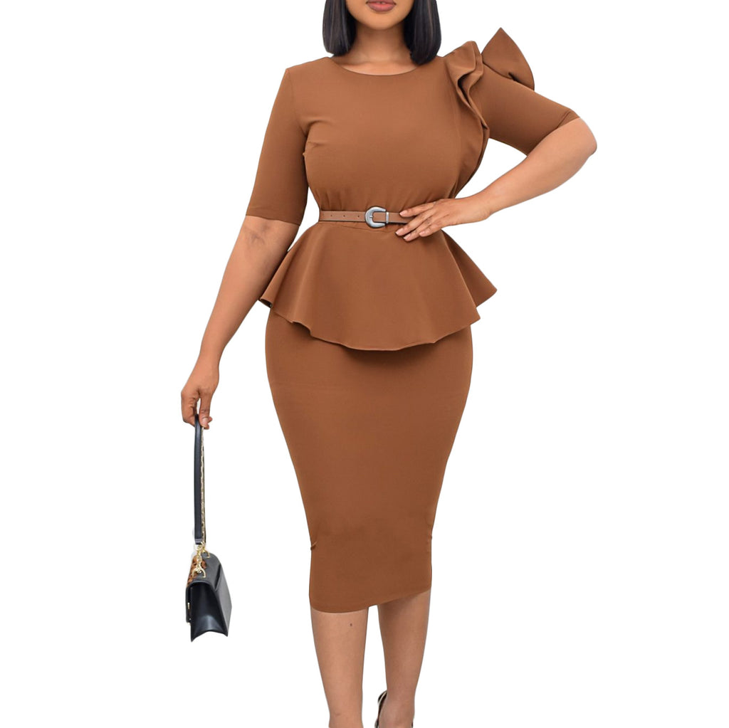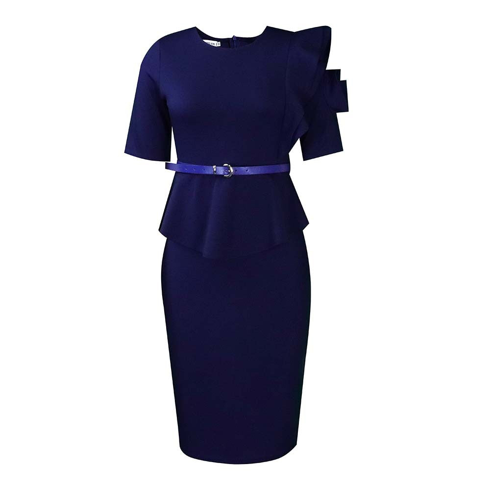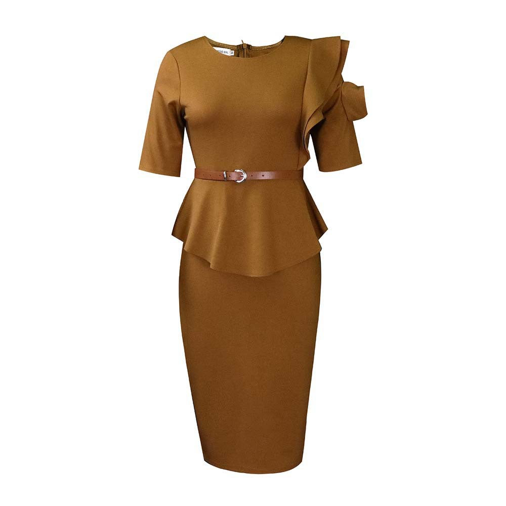 Fühlen Sie sich bei allem, was Sie tun, sicher, wenn Sie das Set aus Schößchentop und Bleistiftrock für Damen mit Rüschenärmeln tragen, das ein Design auf einem Ärmel und einen dünnen Gürtel um die Taille aufweist, um Ihre Kurven zu betonen.