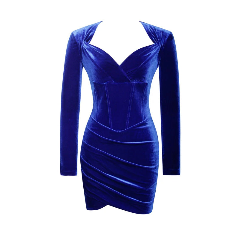 Damen Blue Velvet Long Sleeved Mini Kleid mit V-Ausschnitt