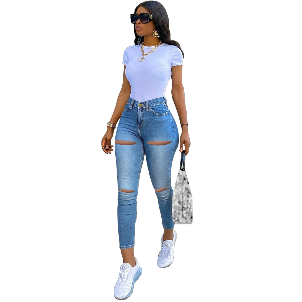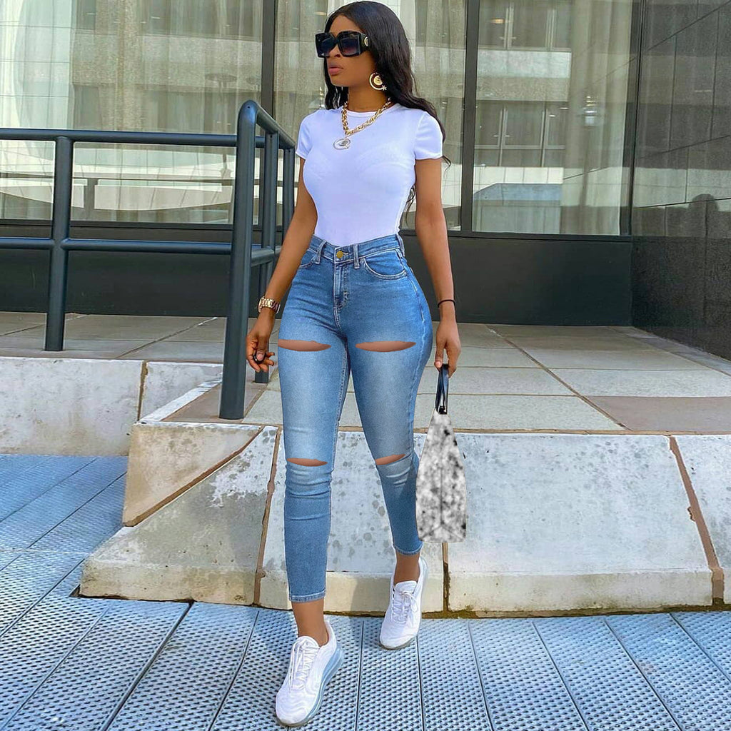 Sehen Sie in jedem Oberteil süß aus, wenn Sie es mit der Skinny Denim Jeans mit hoher Taille für Damen mit Rissen kombinieren. Diese glatten Jeans sind an Oberschenkeln und Knien mit sauberen Rissen unterbrochen.