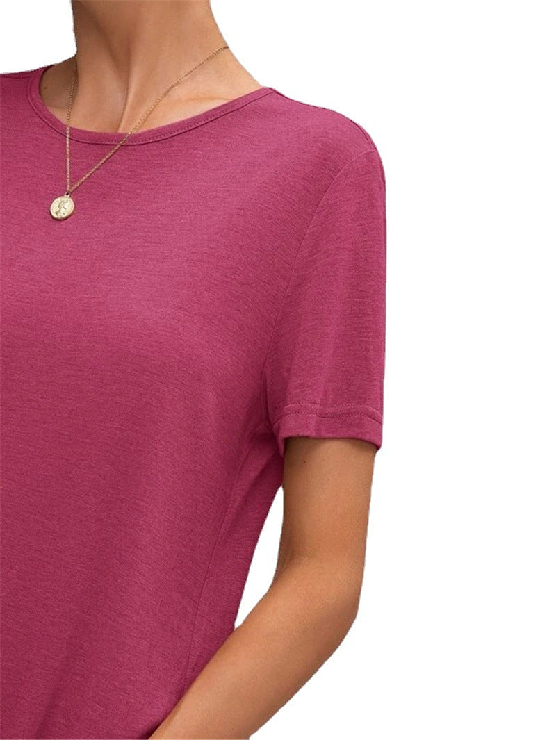 Das Damen-Midi-T-Shirt mit kurzen Ärmeln nimmt einen lässigen Look und aktualisiert ihn für Brunchs und Zusammenkünfte. Es hat einen traditionellen Rundhalsausschnitt und kurze Ärmel wie ein T-Shirt sowie einen Schlitz im Rock.