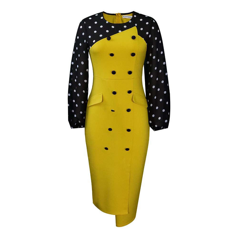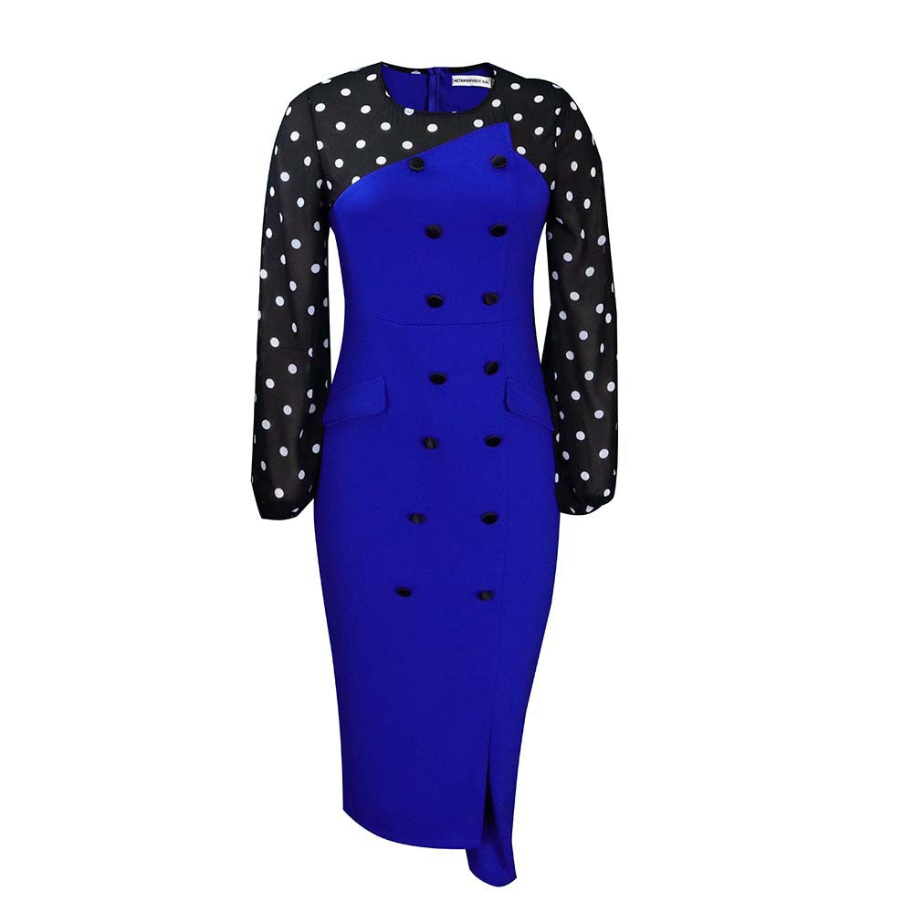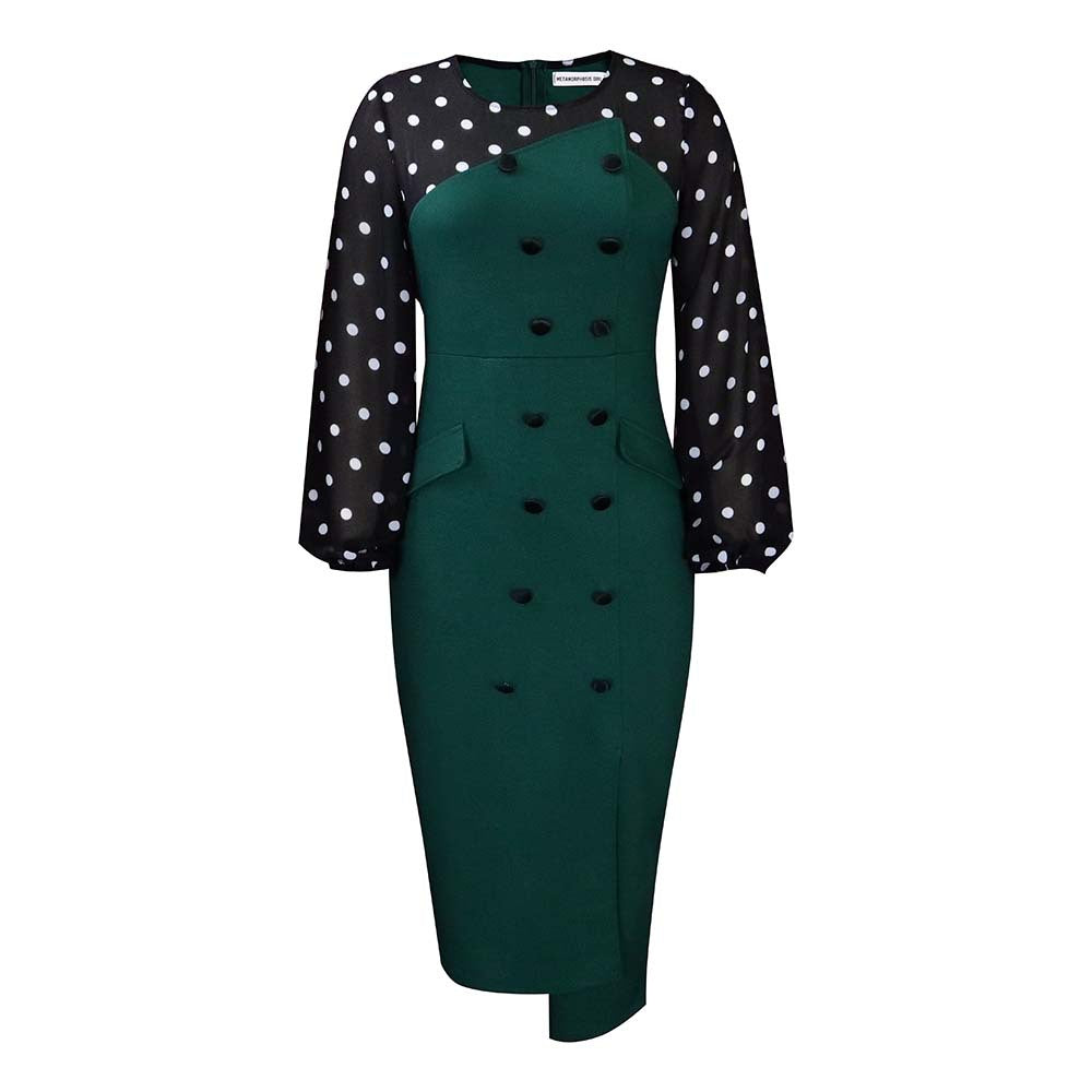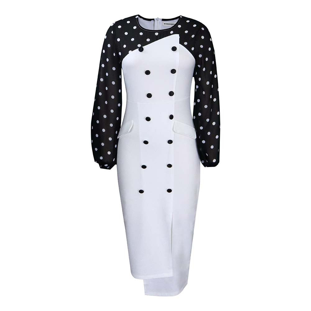 Verwandeln Sie Ihre Geschäftskleidung, wenn Sie sich für das Polka Dot Button Down Pencil Dress für Damen entscheiden. Dieses Midikleid hat einen einfarbigen Bleistiftrock mit Akzentknöpfen sowie ein langärmliges gepunktetes Oberteil.