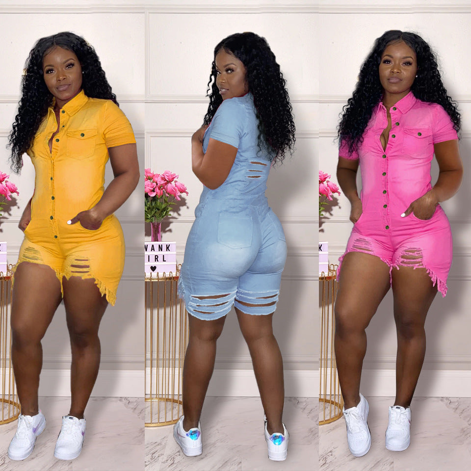 Betonen Sie Ihre Silhouette und verbessern Sie Ihre Freizeitgarderobe mit den Damen-Shorts und dem kurzärmligen Button-Down-Jumpsuit mit zerrissenen Fäden entlang der Oberschenkel und akzentuierten Knöpfen auf der Vorderseite. Es kommt in drei leuchtenden Farben.