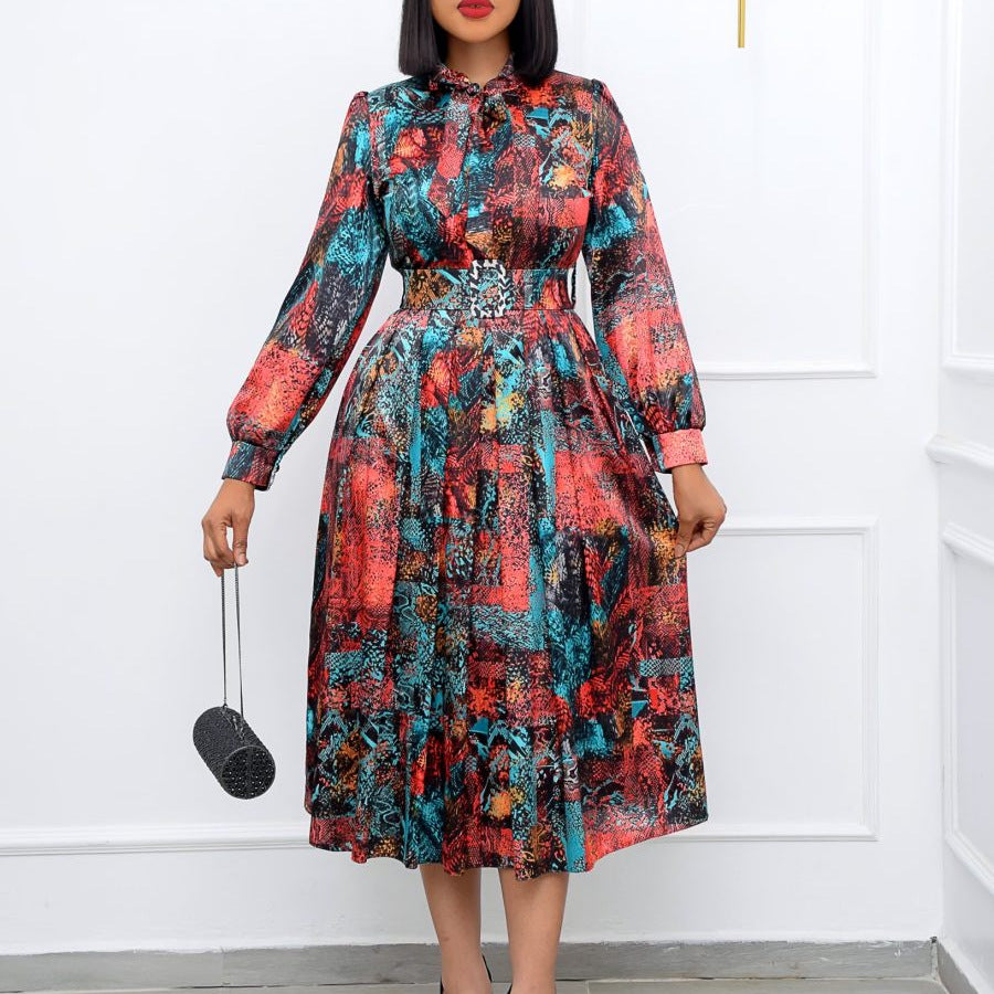 Die schlichte Schönheit des abstrakt gemusterten, langärmligen A-Linien-Kleides für Damen ist eine schmeichelhafte und schöne Wahl für jeden Anlass. Es verfügt über eine geraffte Taille, die Ihre Figur betont, und einen klassischen Umschlagkragen.