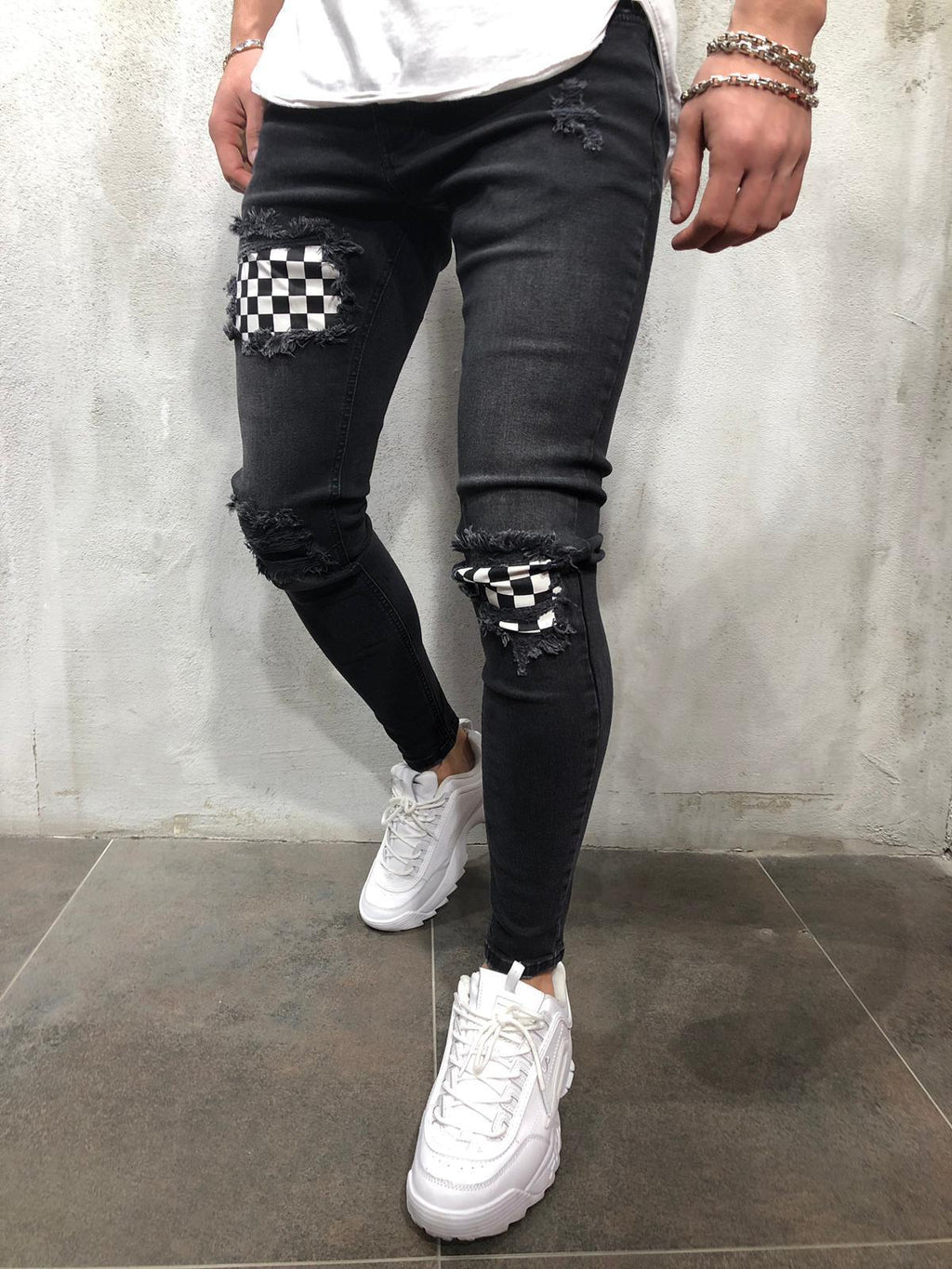 Ziehen Sie die Blicke aller auf der Straße auf sich, wenn Sie die Ripped Denim Straight Leg Jeans für Herren mit Schachbrettmuster tragen. Durch den Stoff lugt ein Schachbrettmuster, das Farbe und Textur hinzufügt.