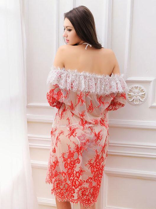 Das Dragon's Wings Dessous-Set kombiniert weiche, durchsichtige Spitze mit unwiderstehlichen Bändern, die dieses kaum vorhandene Ensemble drehen, kreuzen und zusammenhalten. Das seidige String-Bikini-Höschen ist mit femininer Blumenspitze verziert, die zu der koketten Stoffabdeckung und dem zarten Kimono mit Spitzenkanten passt. Welche Seidenschleife wird er zuerst lösen?