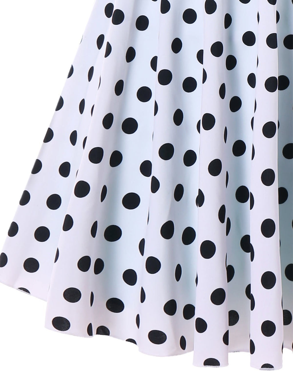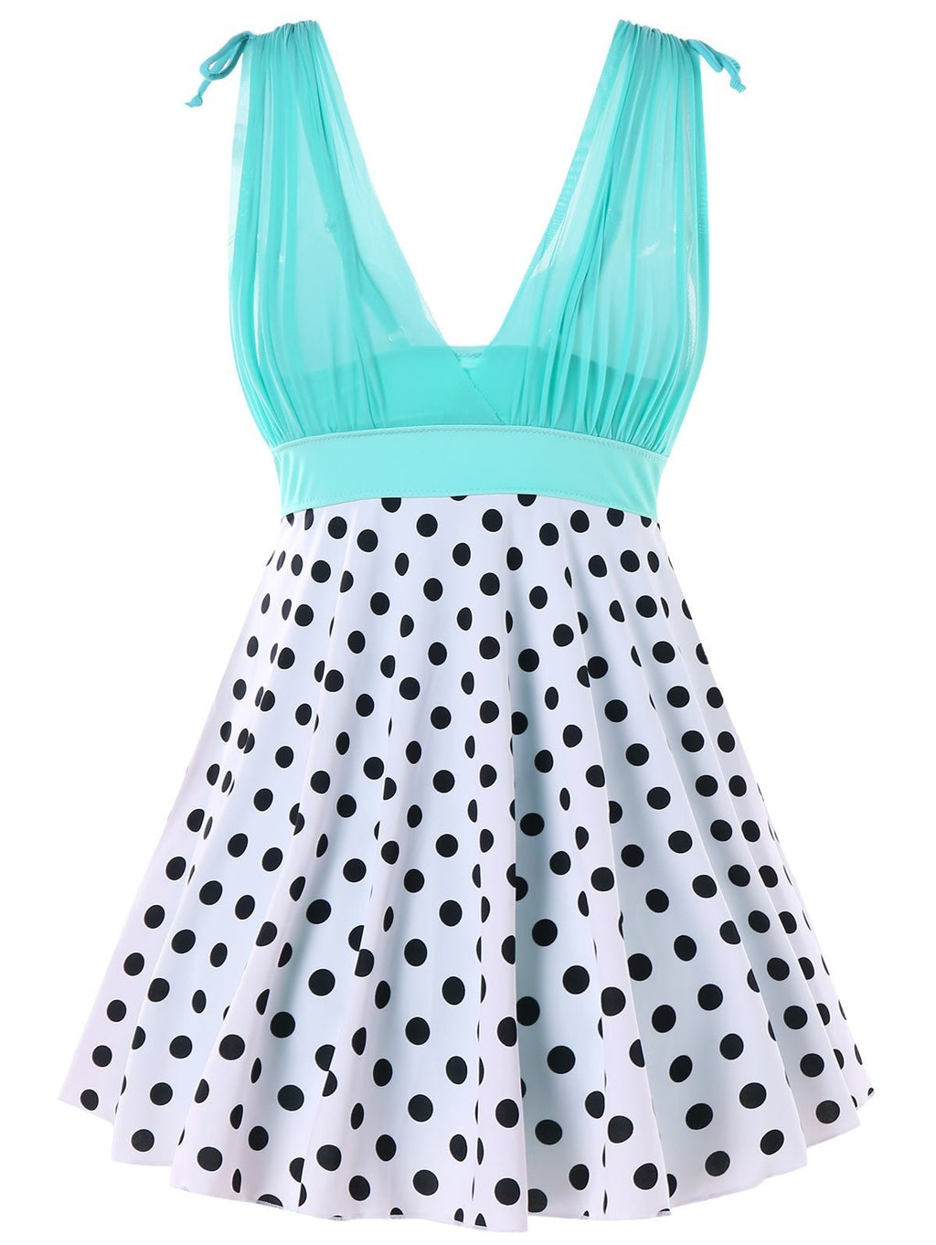 Diese stilvolle Bademode verfügt über das Chiffon-Panel-Design mit geraffter Vorderseite und Kordelzug an der Schulter, einen tiefen Schnitt von vorne nach hinten, ein Empire-Taillen-Design mit einem zarten Schleifenknoten und den ausgestellten Boden mit dem Retro-Akzent des Tupfenmusters.