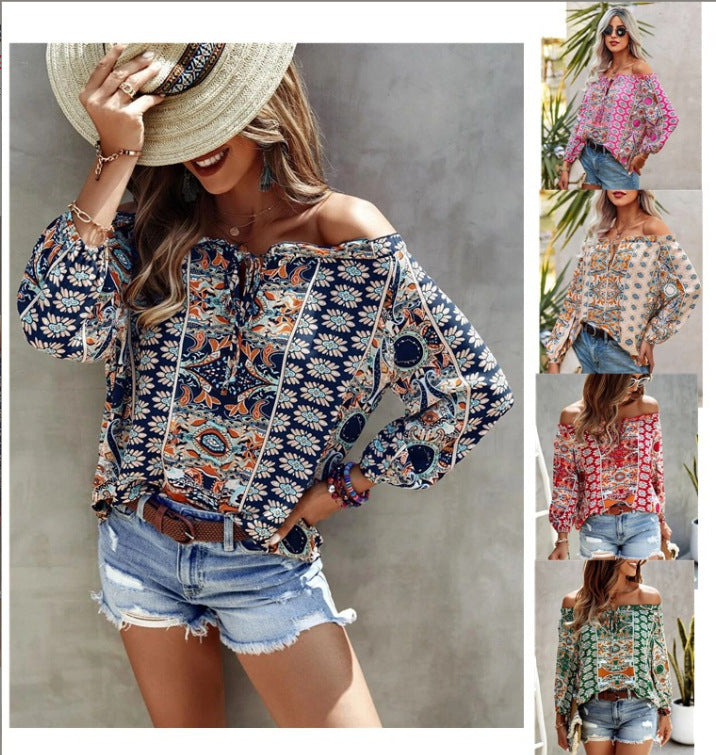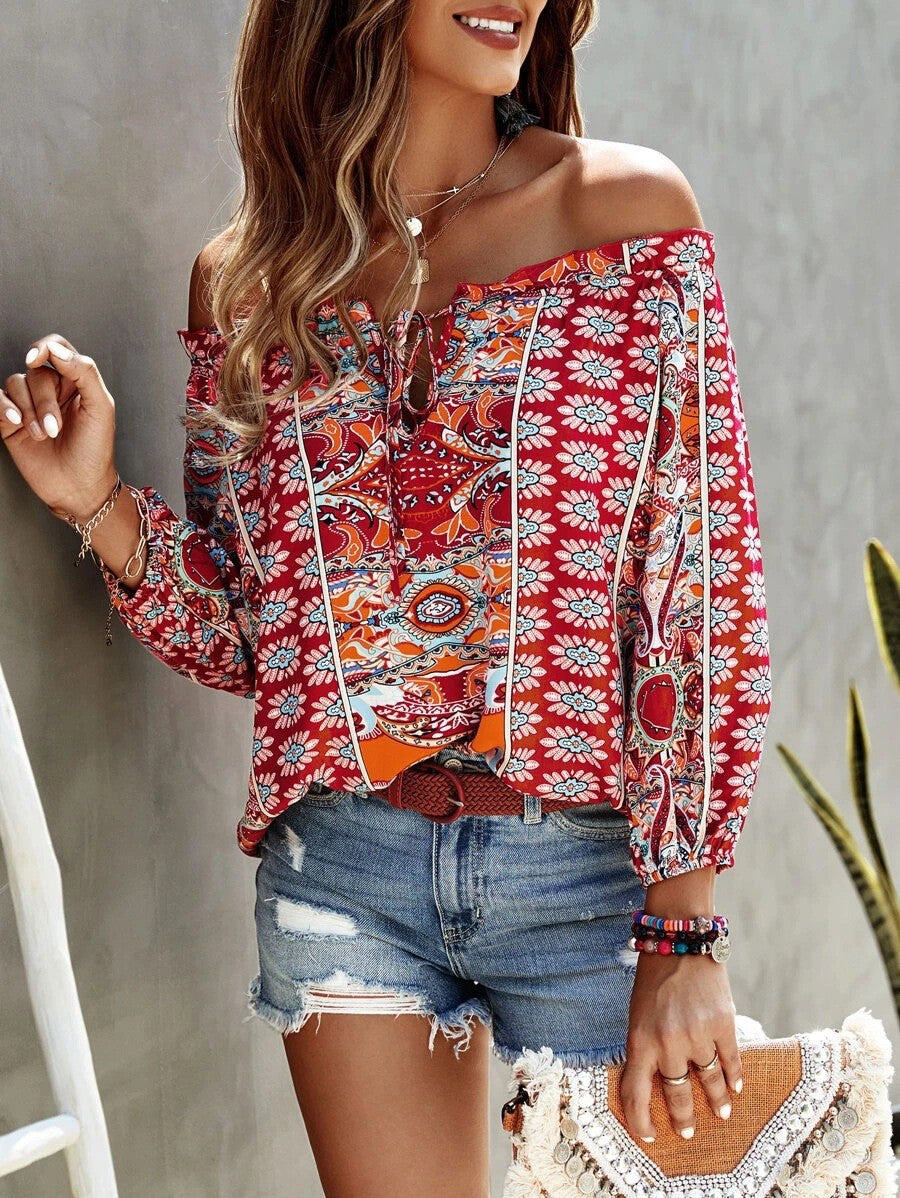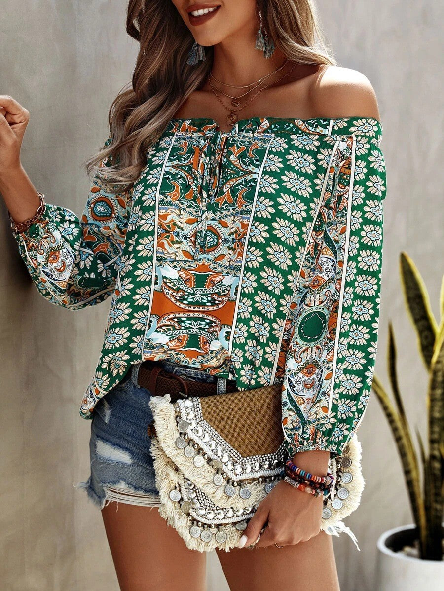 Geben Sie mit Ihrer Kleidung ein Statement ab, wenn Sie das europäisch inspirierte gemusterte schulterfreie Oberteil tragen. Dieses Top hat lange Ärmel und einen weiten Ausschnitt, der für einen schicken Look schulterfrei sitzt.