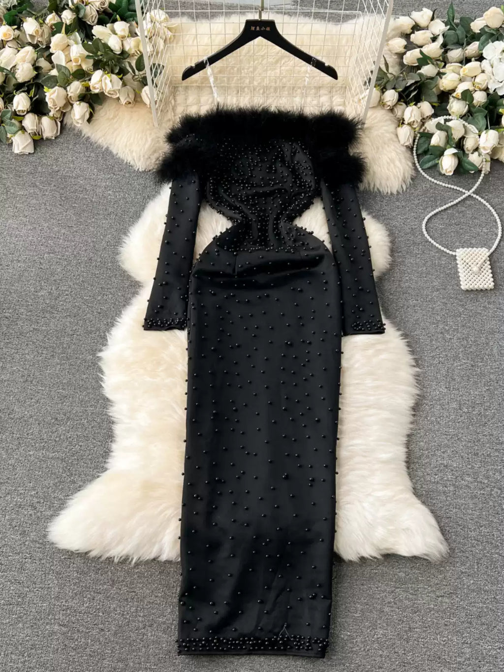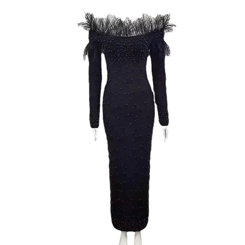 Sehen Sie bei Ihrer nächsten Dinnerparty elegant und kultiviert aus in dem Damen-Maxikleid mit gefiedertem Oberteil und langer Passform. Es sticht mit den leichten Federn an den Armen und dem Oberteil und den Juwelen entlang des Rocks hervor.