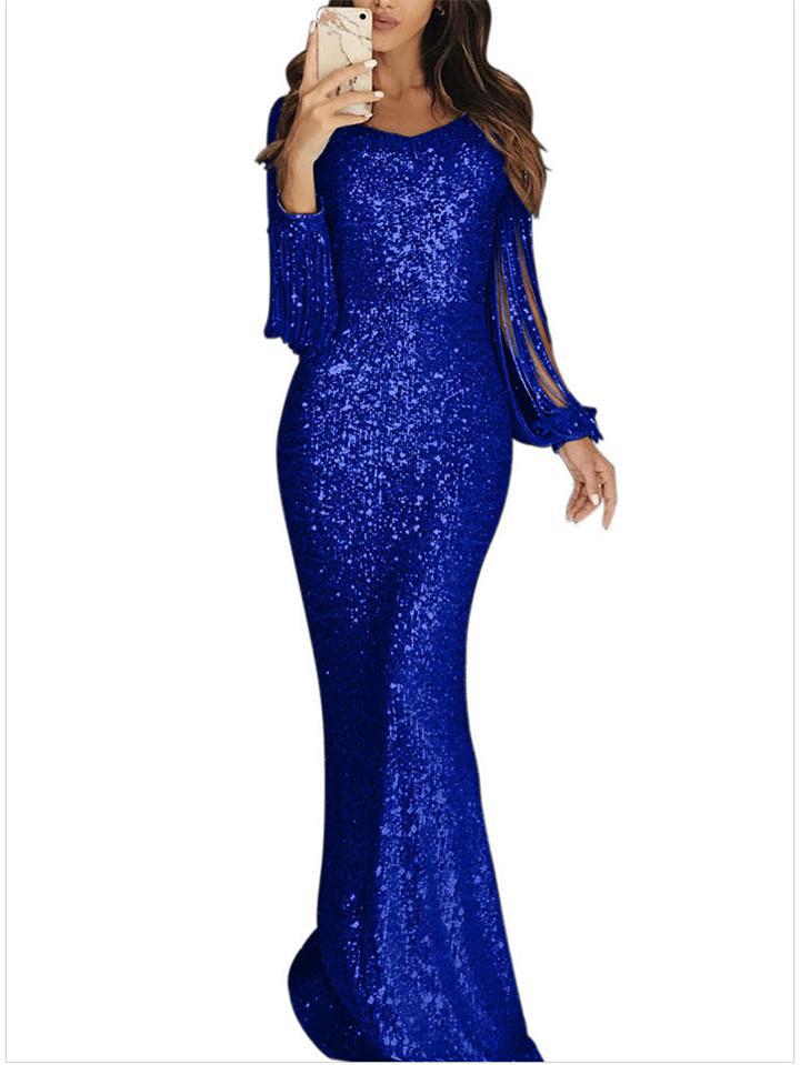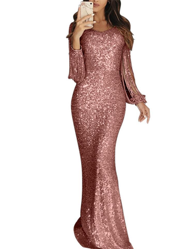 Sehen Sie bei jedem formellen Anlass elegant und königlich aus, indem Sie das figurbetonte, glitzernde Old Hollywood-Kleid für Frauen mit Netzärmeln tragen. Es schmiegt sich an Ihre Kurven, um Ihnen eine schmeichelhafte Silhouette zu verleihen, und hat einzigartige transparente Ärmel.