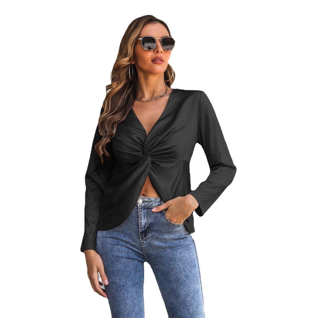 Fügen Sie Ihrer täglichen Kleidung einen flirty Touch hinzu, wenn Sie die eng anliegende Damenbluse mit V-Ausschnitt und Peekaboo-Loch anziehen, die einen Hauch Ihrer Taille zeigt. Wählen Sie zwischen einer eleganten weißen oder schwarzen Farbe.