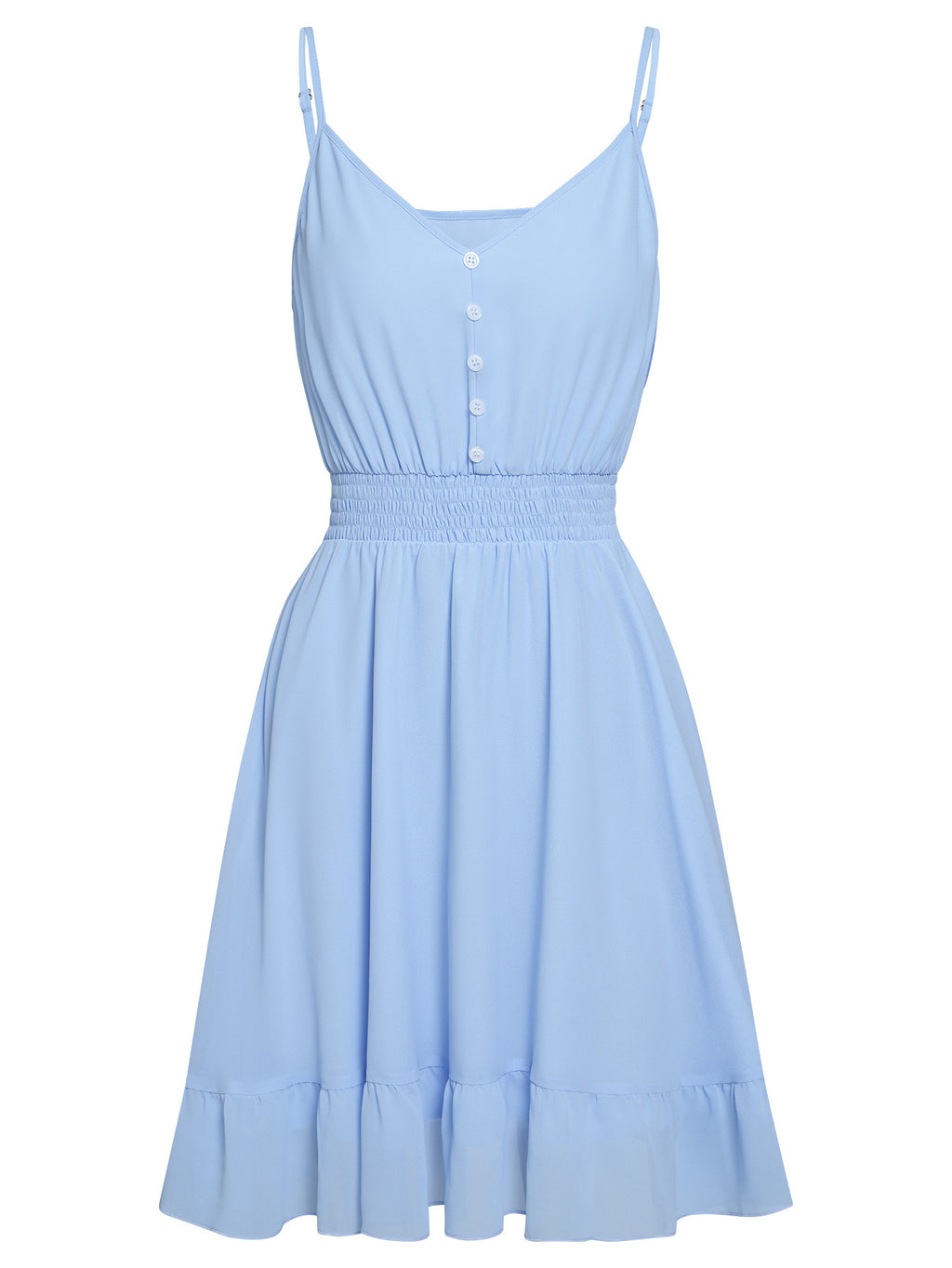 Schauen Sie sich während eines Sommer -Events, der das ärmelloses Babydoll -Kleid der Frauen mit herzhaftem Ausschnitt trägt. Es verfügt über einen gekräuselten Saum mit mittlerer Länge und ist in drei Farben erhältlich.