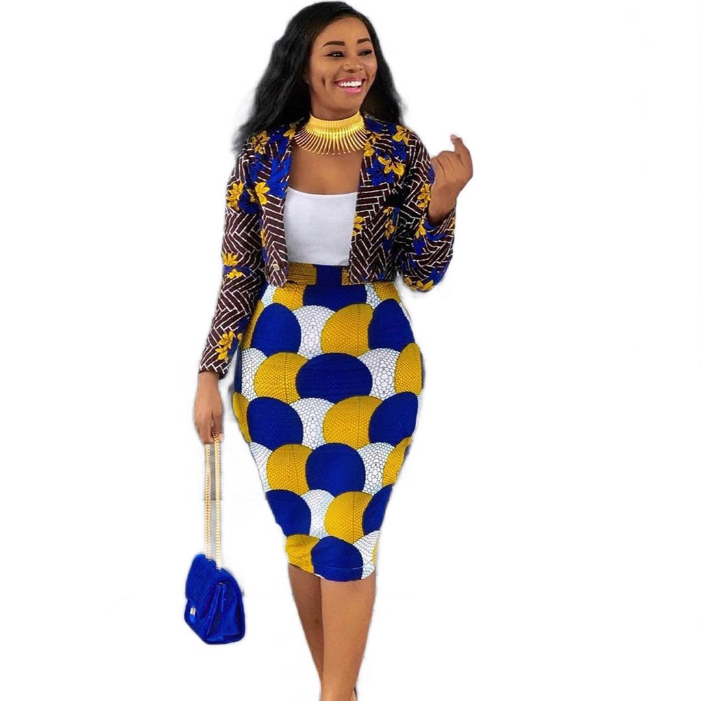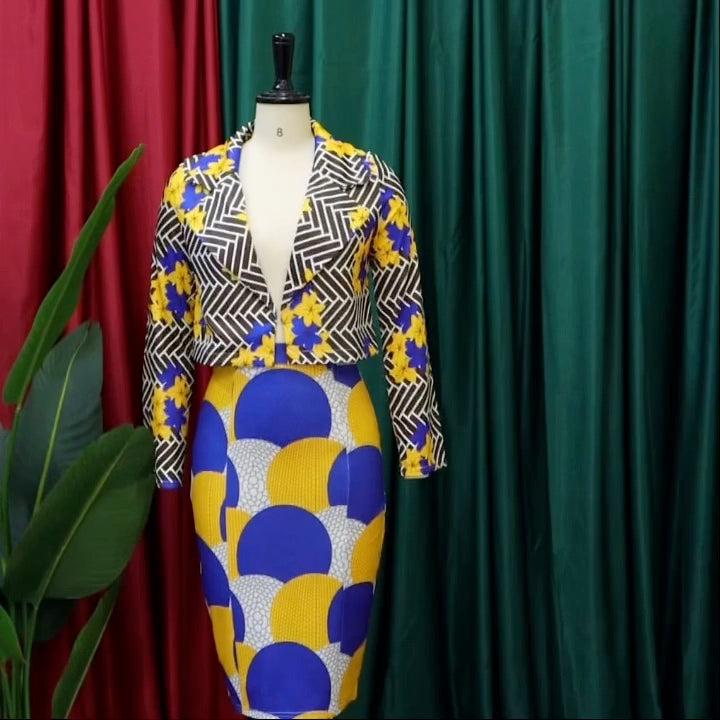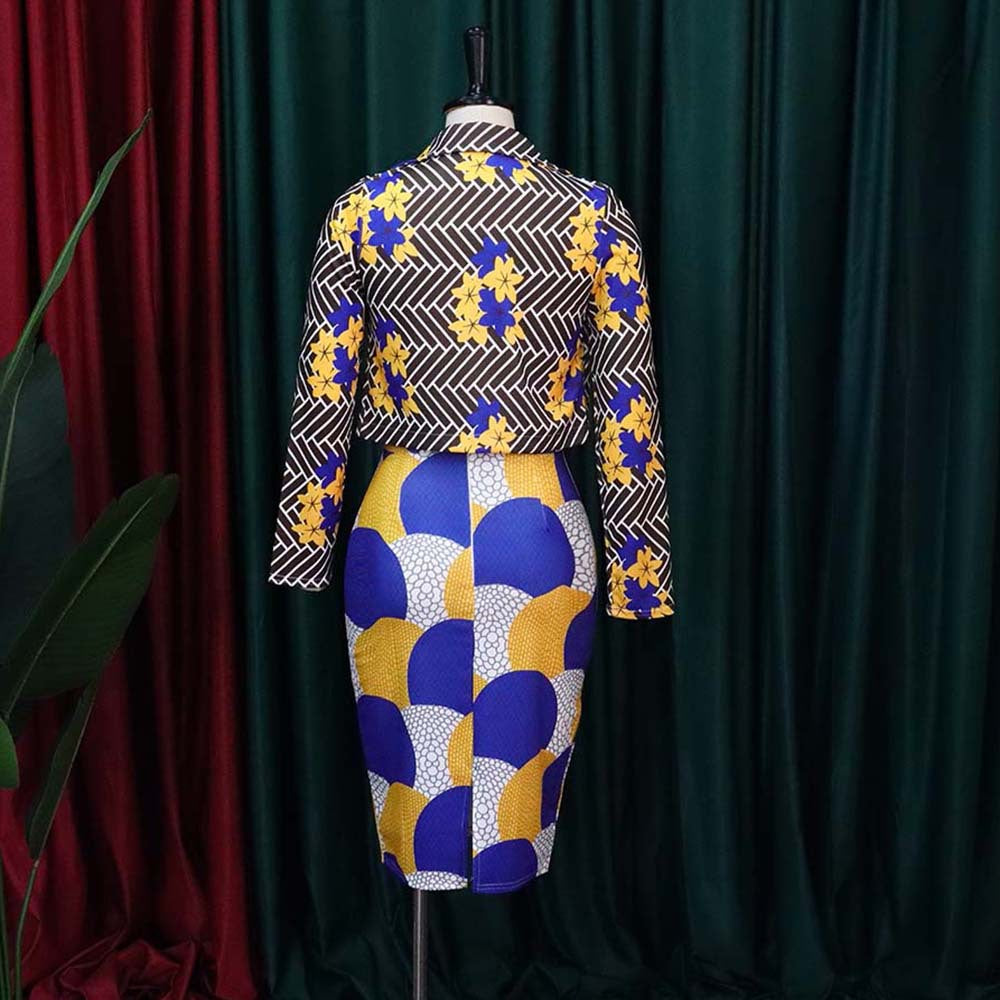 Setzen Sie ein kühnes und farbenfrohes Statement mit diesem Art-Deco-inspirierten zweiteiligen Set aus Jacke und Kleid für Damen. Es verfügt über ein Art-Deco-Muster im Stil der 1940er Jahre in einem farbenfrohen Farbschema in Gold, Blau und Weiß.