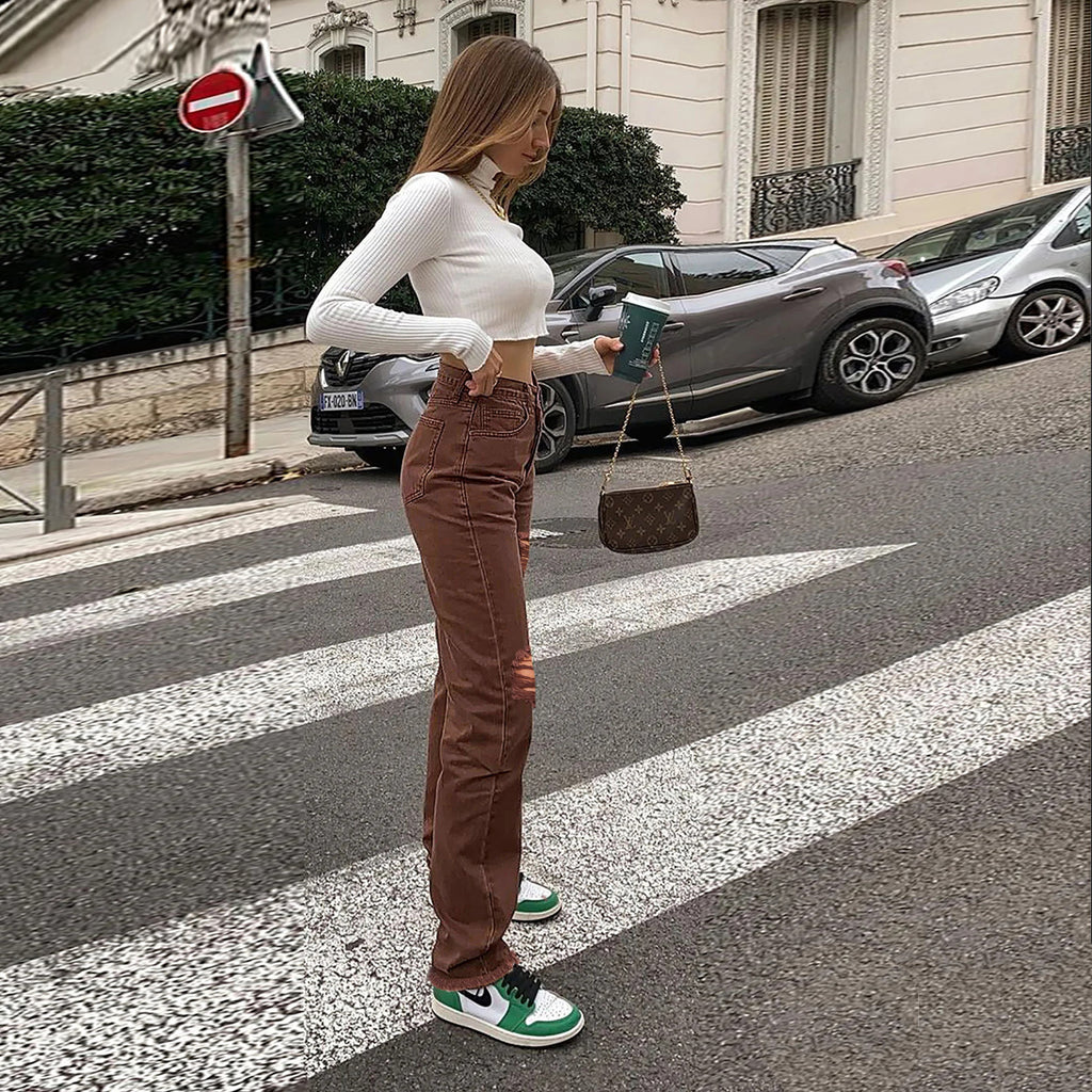 Bringen Sie Retro-Stile in Ihre Alltagskleidung zurück mit dieser Damen-Jeans mit hohem Bund, erdigem Braun und Rissen und abgenutzten Stellen an Oberschenkeln und Knien.