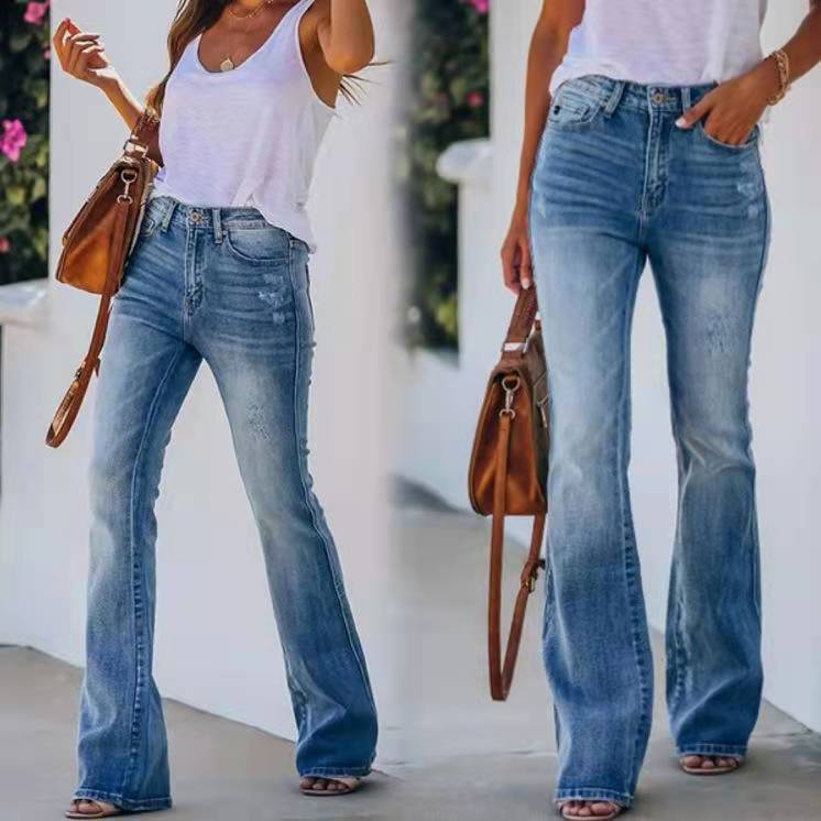Vervollständigen Sie Ihre Casual-Garderobe mit der Women's Casual Denim Blue Jeans mit Faded Legs. Diese Jeans hat eine hohe Taille, die schmeichelhaft ist, und einen locker sitzenden Schlag entlang der Unterseite der Jeans.