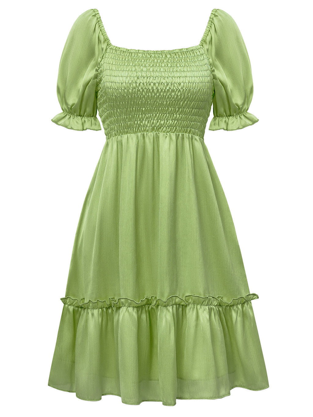Schauen Sie in diesem kurzen Mini -Kleid von Frauen mit dem kurzen Puffärmel mit quadratischem Ausschnitt Ihr Bestes. Dieses Country Chic -Kleid ist in einer von drei Farben erhältlich.