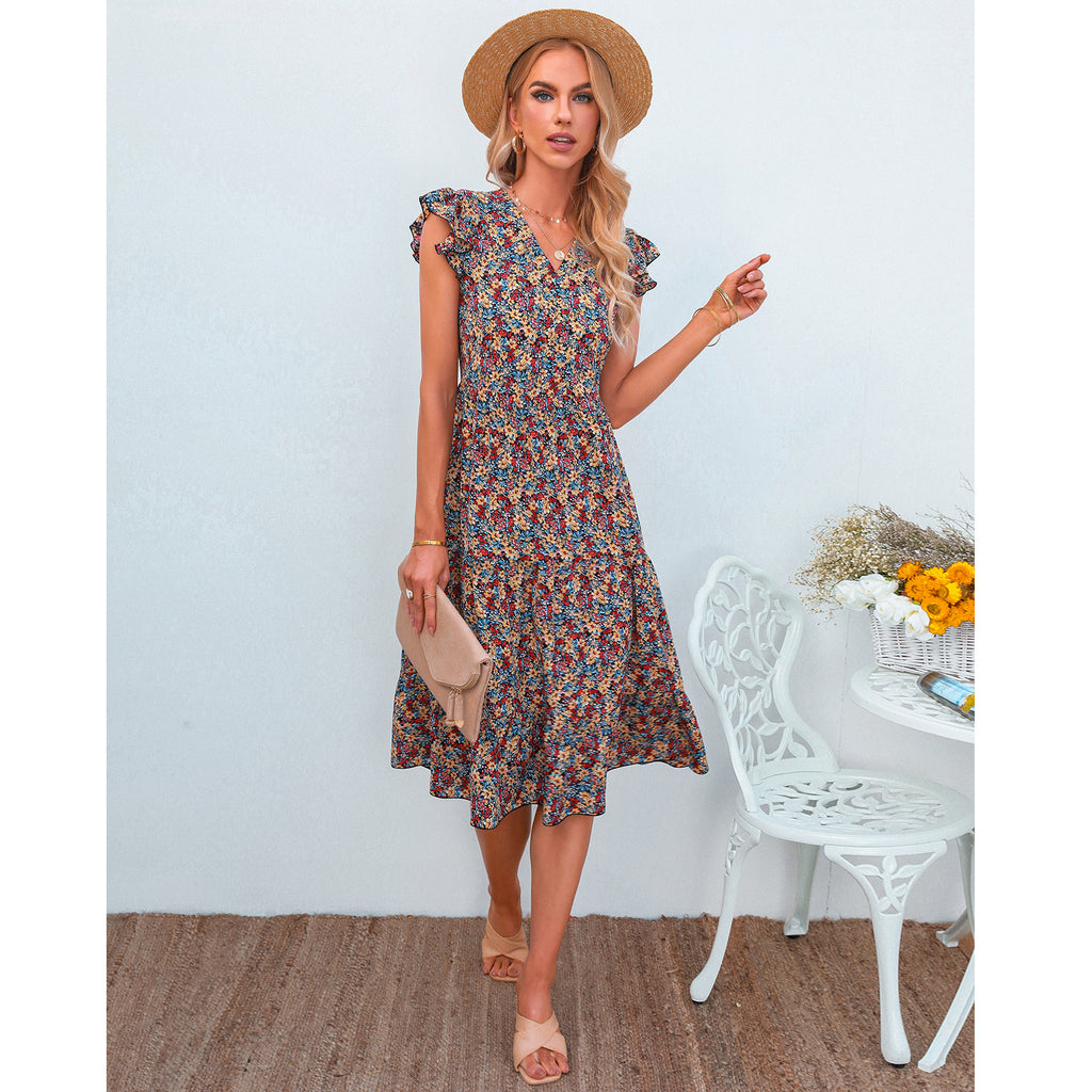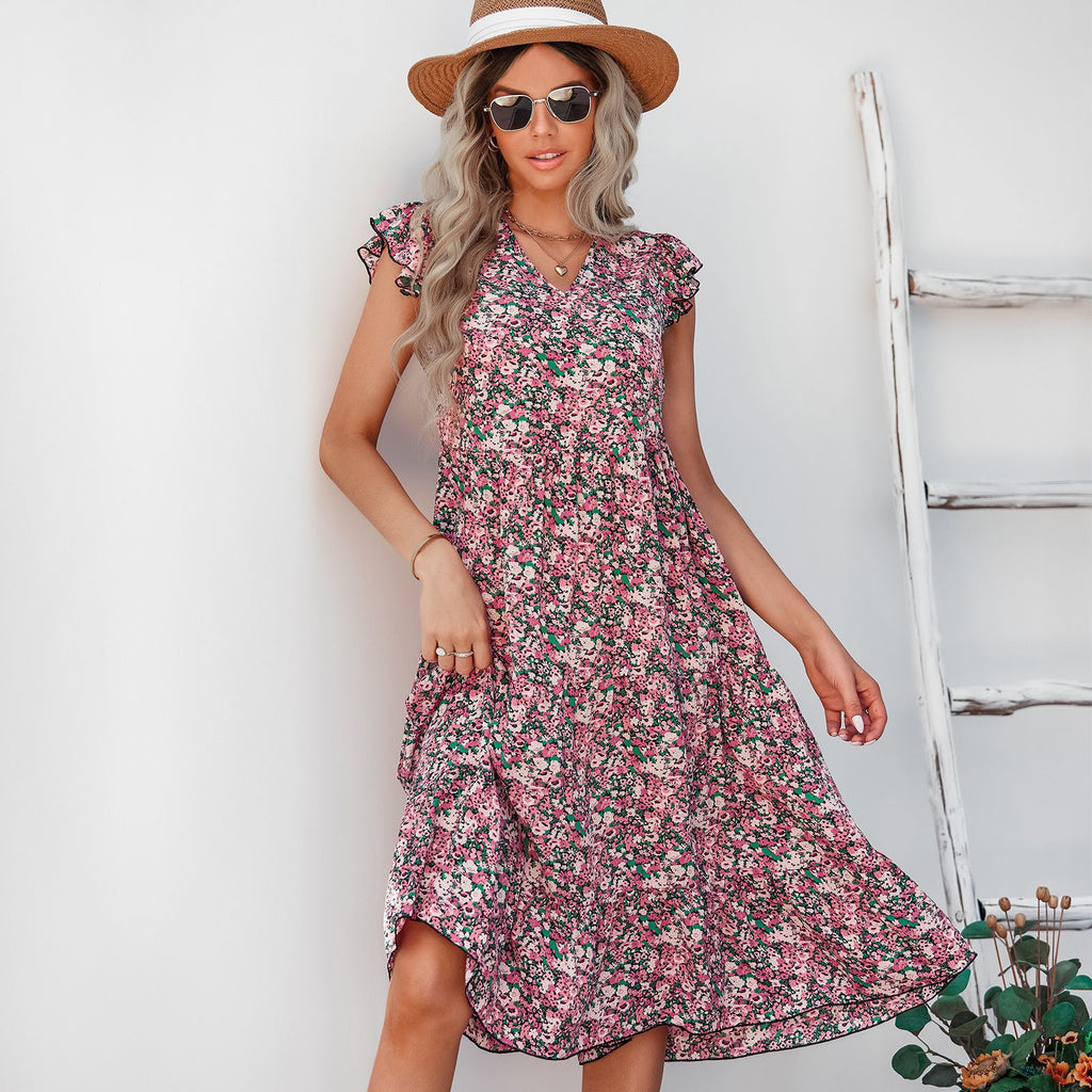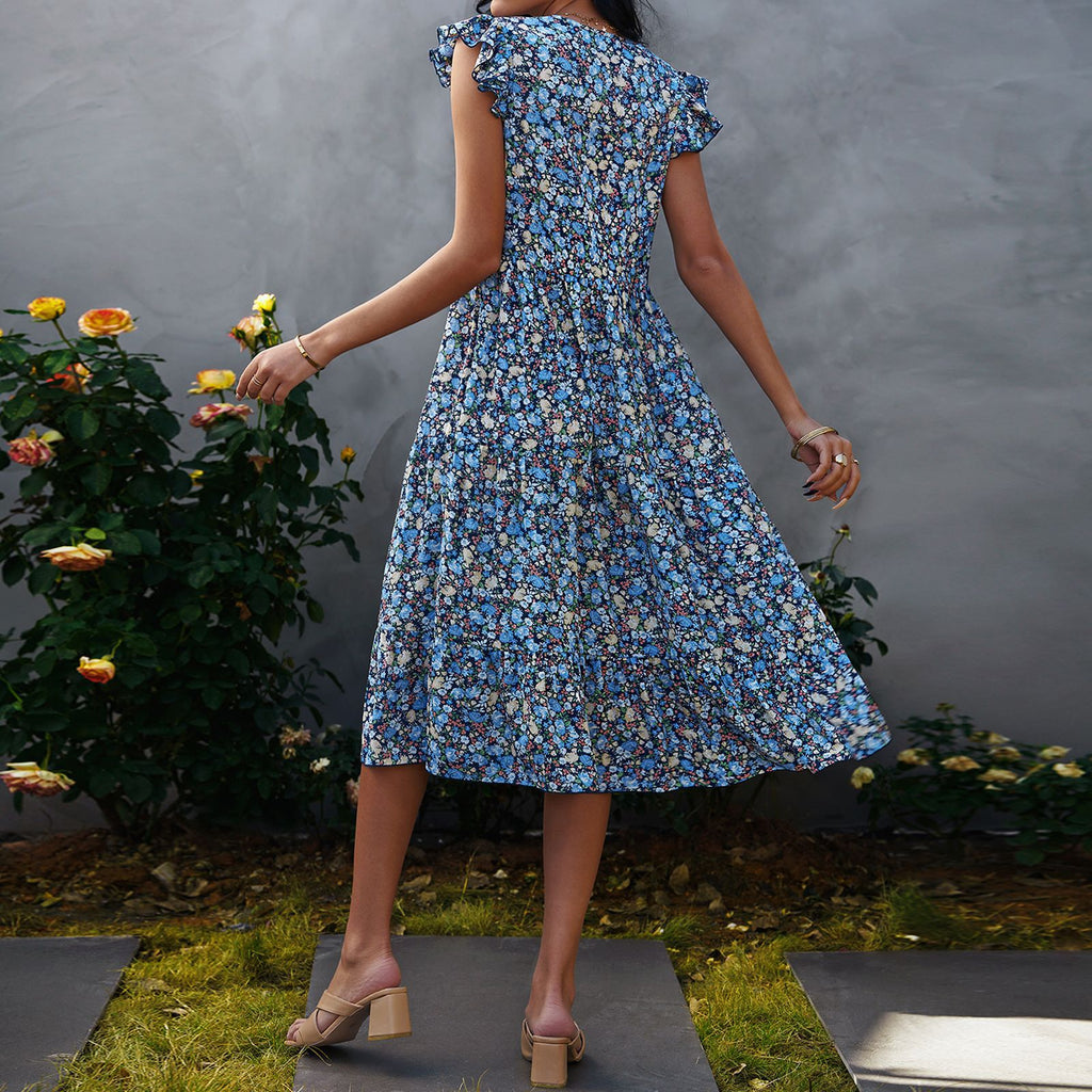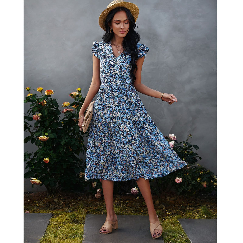 Frauen mit kurzärärmetem Blumendruck Midi Kleid