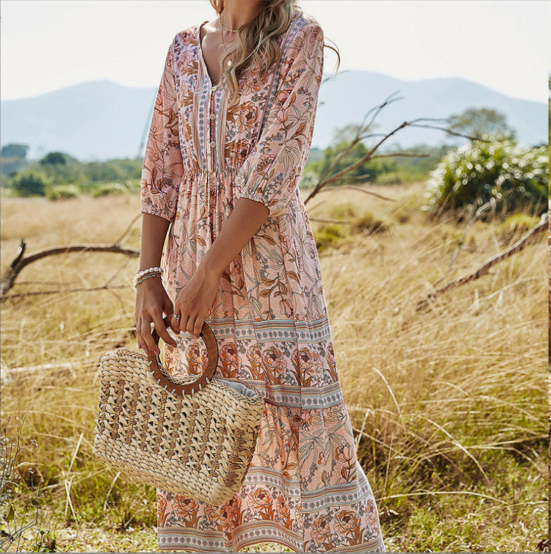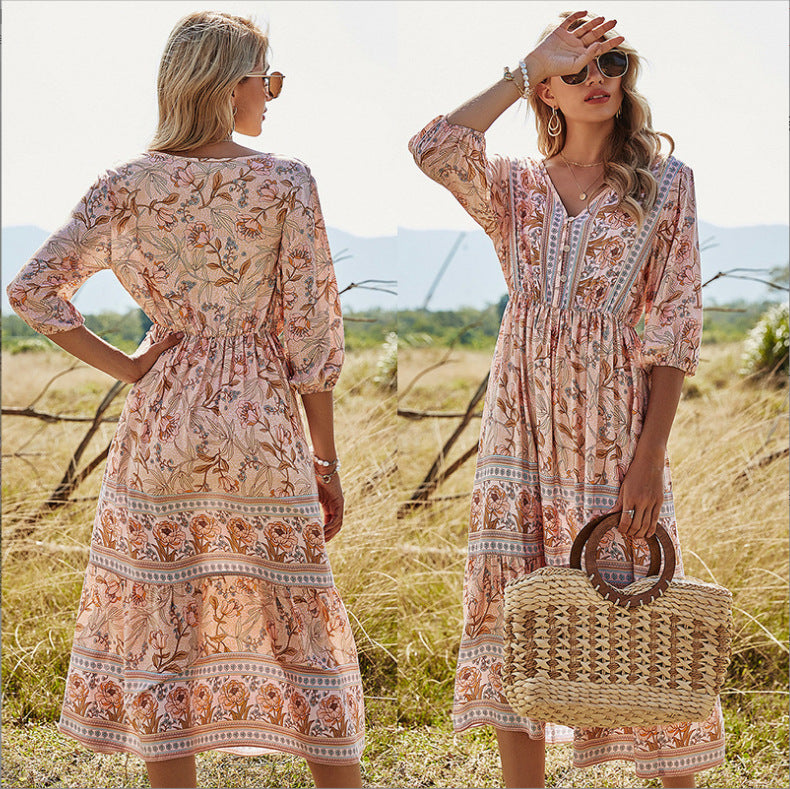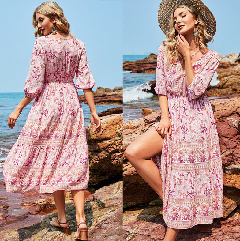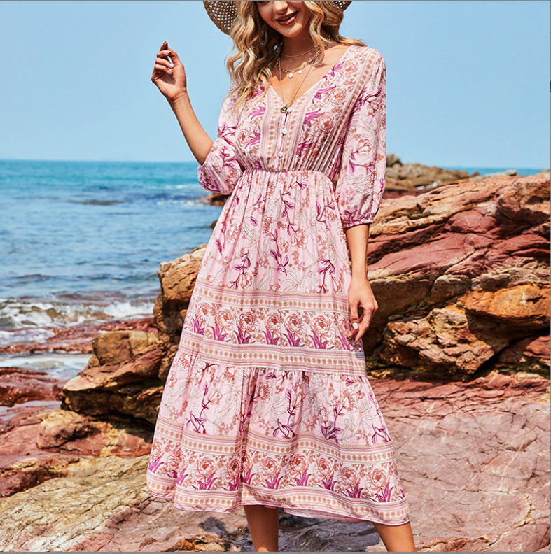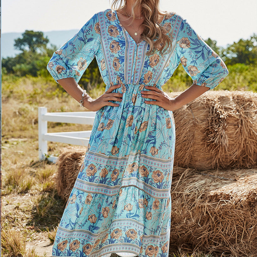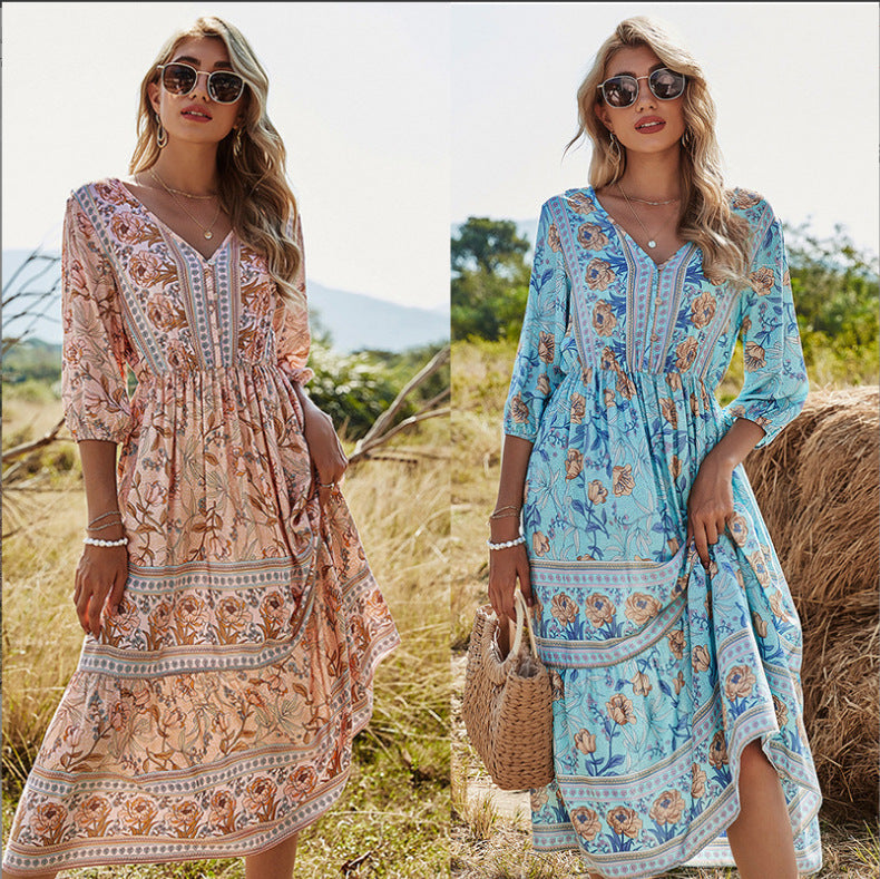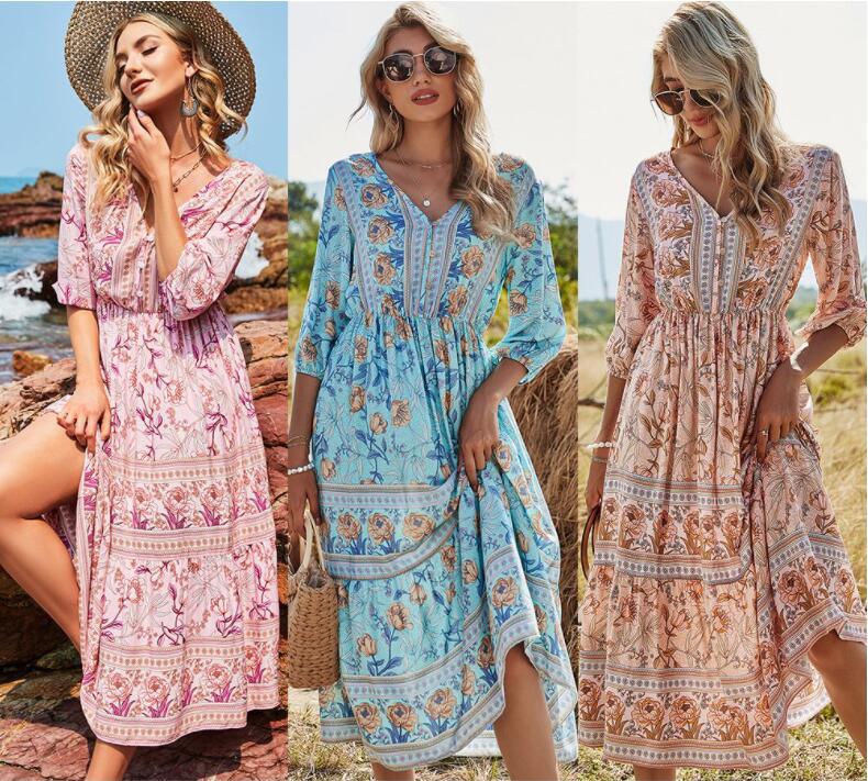 Machen Sie dieses stilvolle Kleid mit einem Blumenmuster zu einem Teil Ihrer Garderobe. So bleiben Sie im Sommer cool und sehen hübsch und stylisch aus. Es besteht aus hochwertigem und dehnbarem Stoff, ist superweich, atmungsaktiv, leicht, nicht zu dünn, nicht zu dick, lässt sich leicht an- und ausziehen und ist im heißen Sommer leicht und bequem zu bewegen. Langlebig genug für Ihr tägliches Tragen, absolut wunderschöne, stilvolle, elegante Artikel, um Ihren einzigartigen femininen Look zu zeigen. Blumenkleid für Damen, V-Ausschnitt, langärmliges, hoch tailliertes Design, lange A-Linien-Röcke, dieses süße Kleid wird Sie diesen Sommer schöner und schöner machen. Sommer-Strandkleid, geeignet für Party, Strand, Urlaub, Verabredung, Cocktail, Heimkehr und Alltag. Modemix mit Heels, Sonnenbrillen, Strandhüten etc.