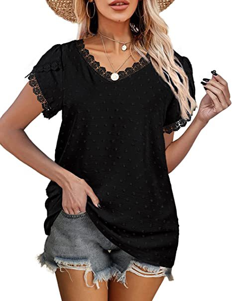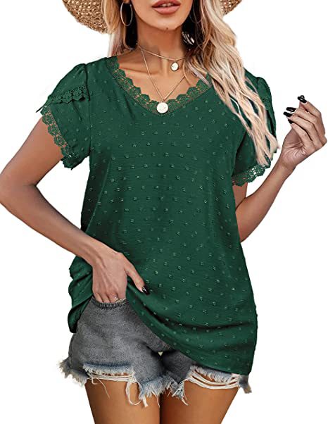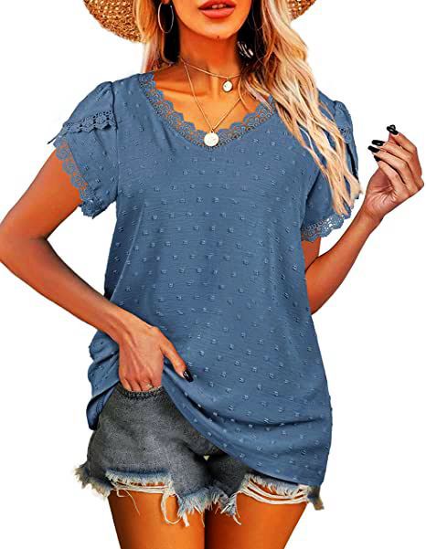 Kühl und luftig, dieses Kurzarm-T-Shirt mit V-Ausschnitt und Petal Lace Stitching für Damen ist perfekt für den Sommer. Es hat Spitzennähte um die Ärmel und den Ausschnitt und ist in sechs Farben erhältlich.