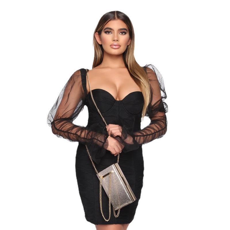 Fügen Sie Ihrem nächtlichen Look einen Hauch von Glamour mit dem Körperkleid der Frauen mit Mesh -Ärmeln hinzu. Rüschen an den Armen und Handgelenken geben ihm eine dramatische einzigartige Silhouette.
