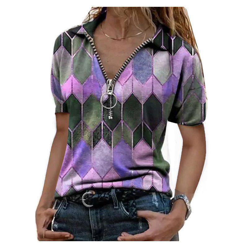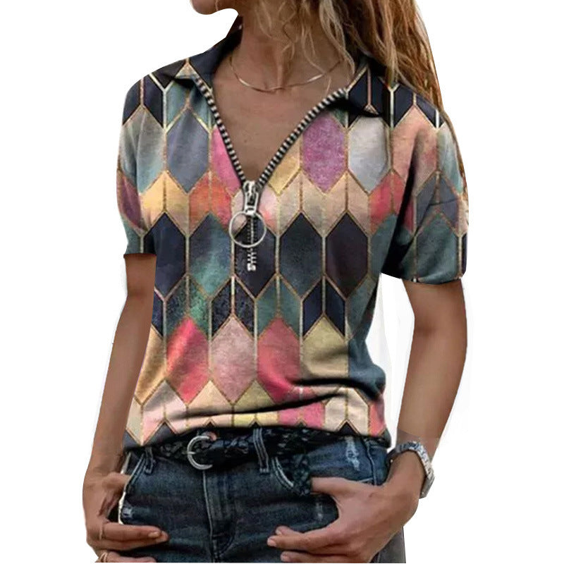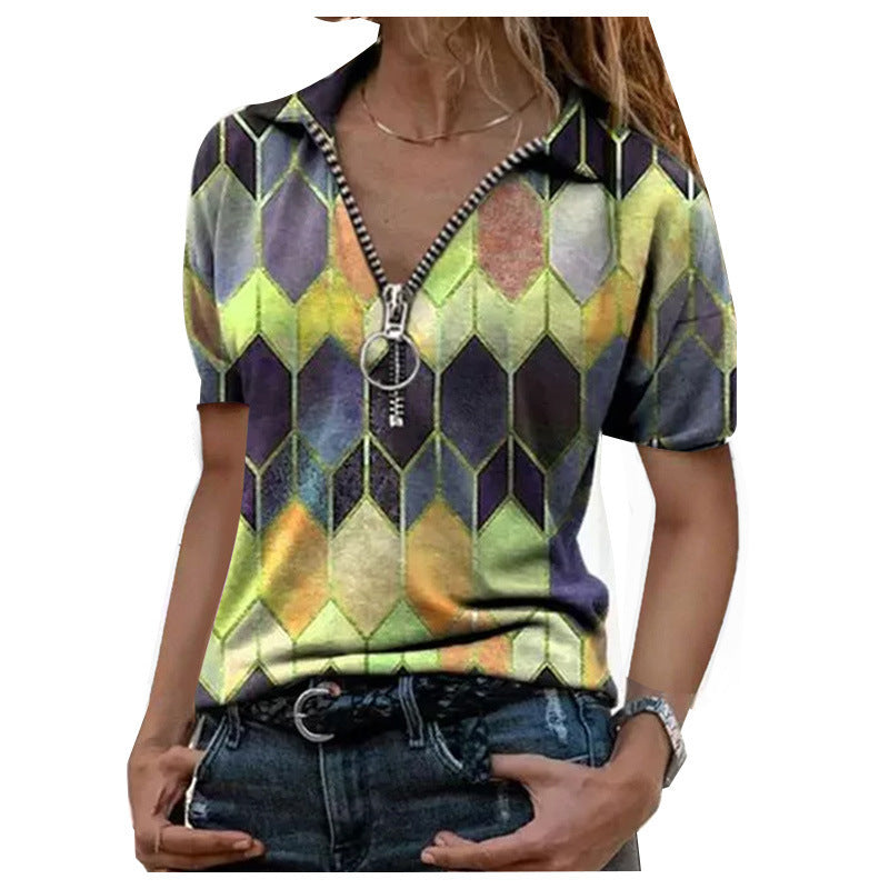 Verleihen Sie Ihren Ensembles einen Farbtupfer mit dem Kurzarmhemd mit geometrischem, modernem Muster und Reißverschluss für Damen. Dieses T-Shirt ist in einer Vielzahl von Farbkombinationen erhältlich, aus denen Sie wählen können.
