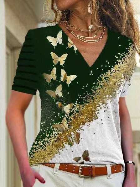 Glitzerndes Kurzarmhemd mit V-Ausschnitt und Schmetterlingsgrafik