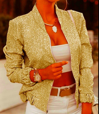 Die glitzernde Blazer-Jacke für Damen mit gerafften Ärmeln ist eine funkelnde, schimmernde Ergänzung für jedes Ensemble. Es ist in Metallic-Farboptionen Ihrer Wahl erhältlich, die Ihr Erscheinungsbild sofort verbessern.