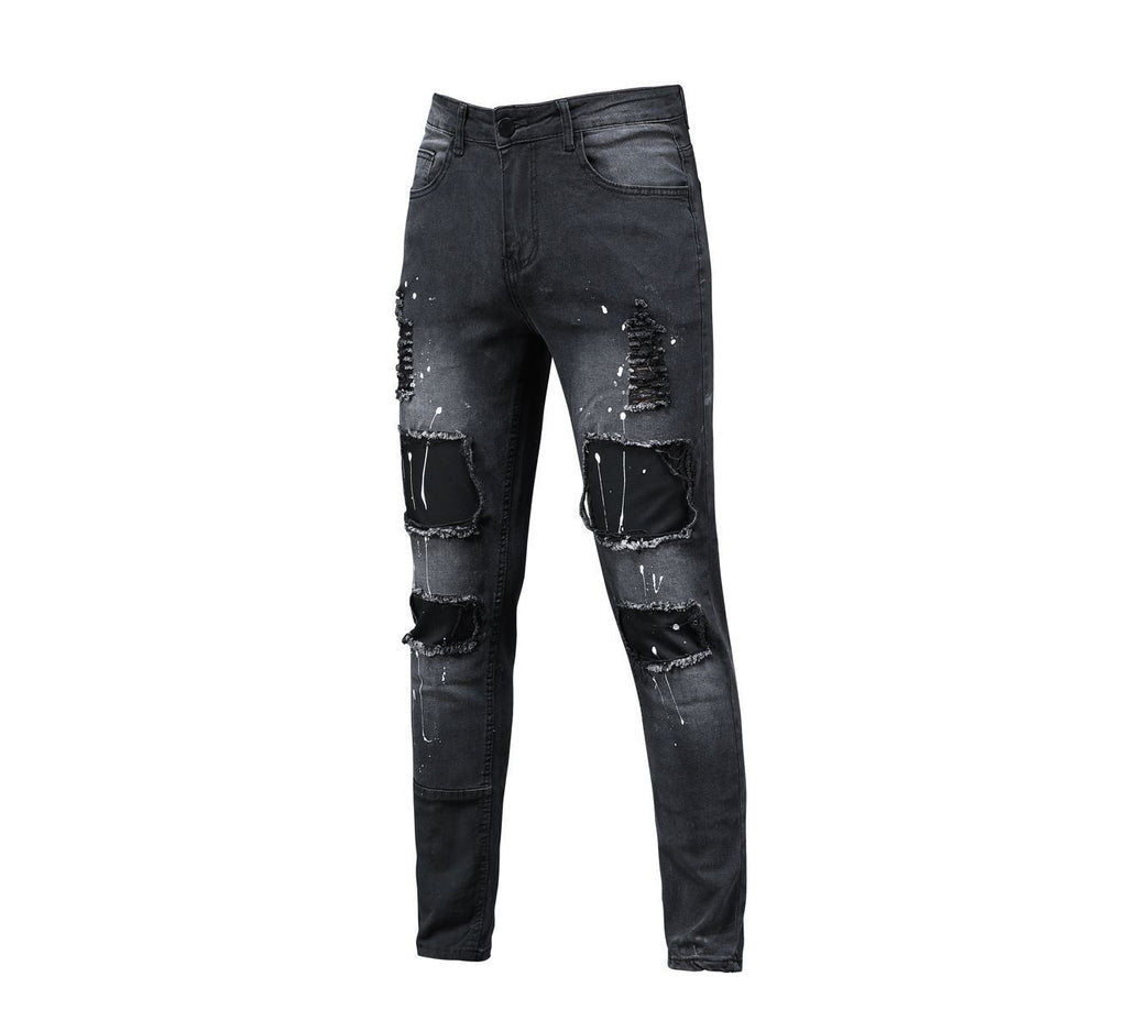 Heben Sie sich auf der Straße hervor, indem Sie diese Men's Urban Dark Denim Jeans mit Tears tragen. Hinter dem Denim befindet sich ein schwarzer Stoff, der Farbspritzer in einer kontrastierenden weißen Farbe beherbergt.
