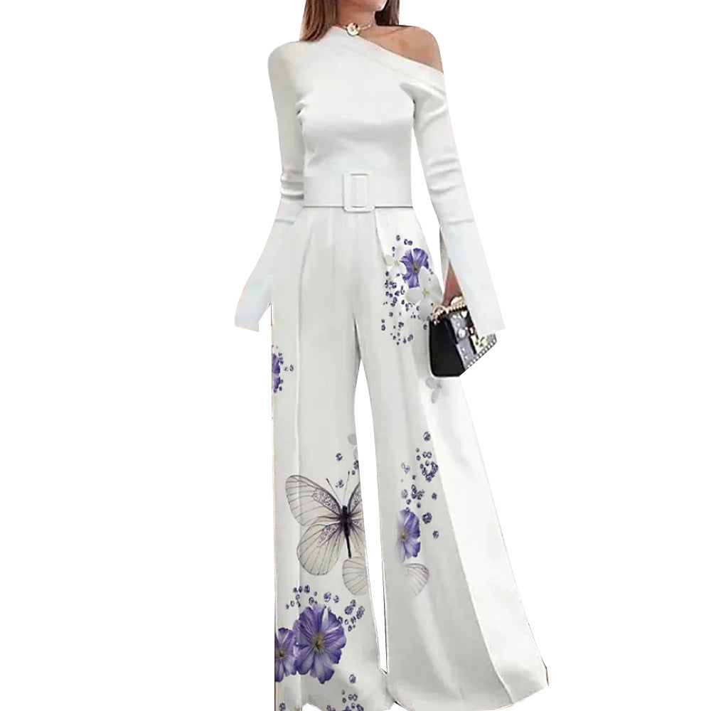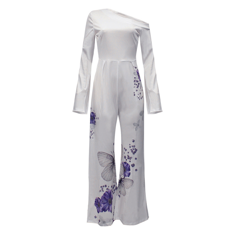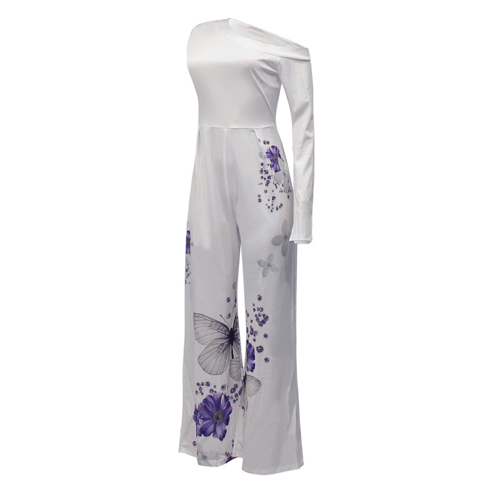 Genießen Sie den klassischen Look vergangener Zeiten mit dem Langarm-Bodysuit mit kalter Schulter und Schmetterlingsmuster für Damen. Dieser weiße Ganzkörperanzug hat weite Beine mit Blumen und Schmetterlingen, die sie schmücken.