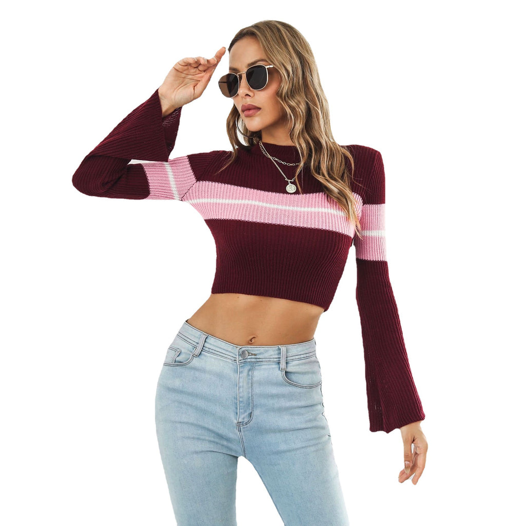 Kurzer Pullover mit Streifen und langen Glockenärmeln