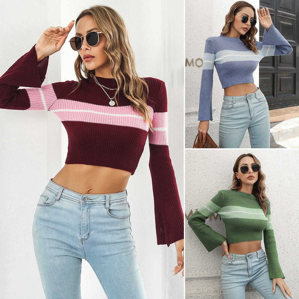 Geben Sie sich Ihrer Liebe zum Retro-Stil hin, wenn Sie den kurz geschnittenen Damenpullover mit Streifen und langen Glockenärmeln tragen. Die Kombination aus verkürztem Saum und Glockenärmeln verleiht ihm einen 1970er-Look.