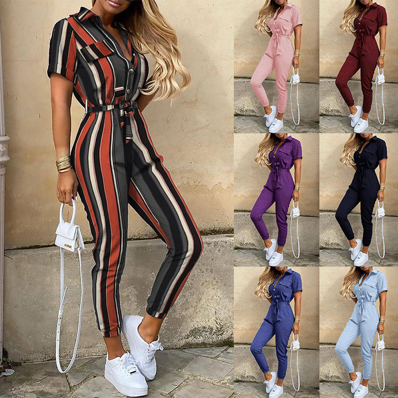 Betonen Sie Ihre Figur und heben Sie sich von der Masse ab, indem Sie den kurzärmligen, knöchellangen Ganzkörperanzug für Damen mit V-Ausschnitt tragen. Dieser farbenfrohe Einteiler hat einen Gürtel um die Taille, der ihm mehr Form verleiht.