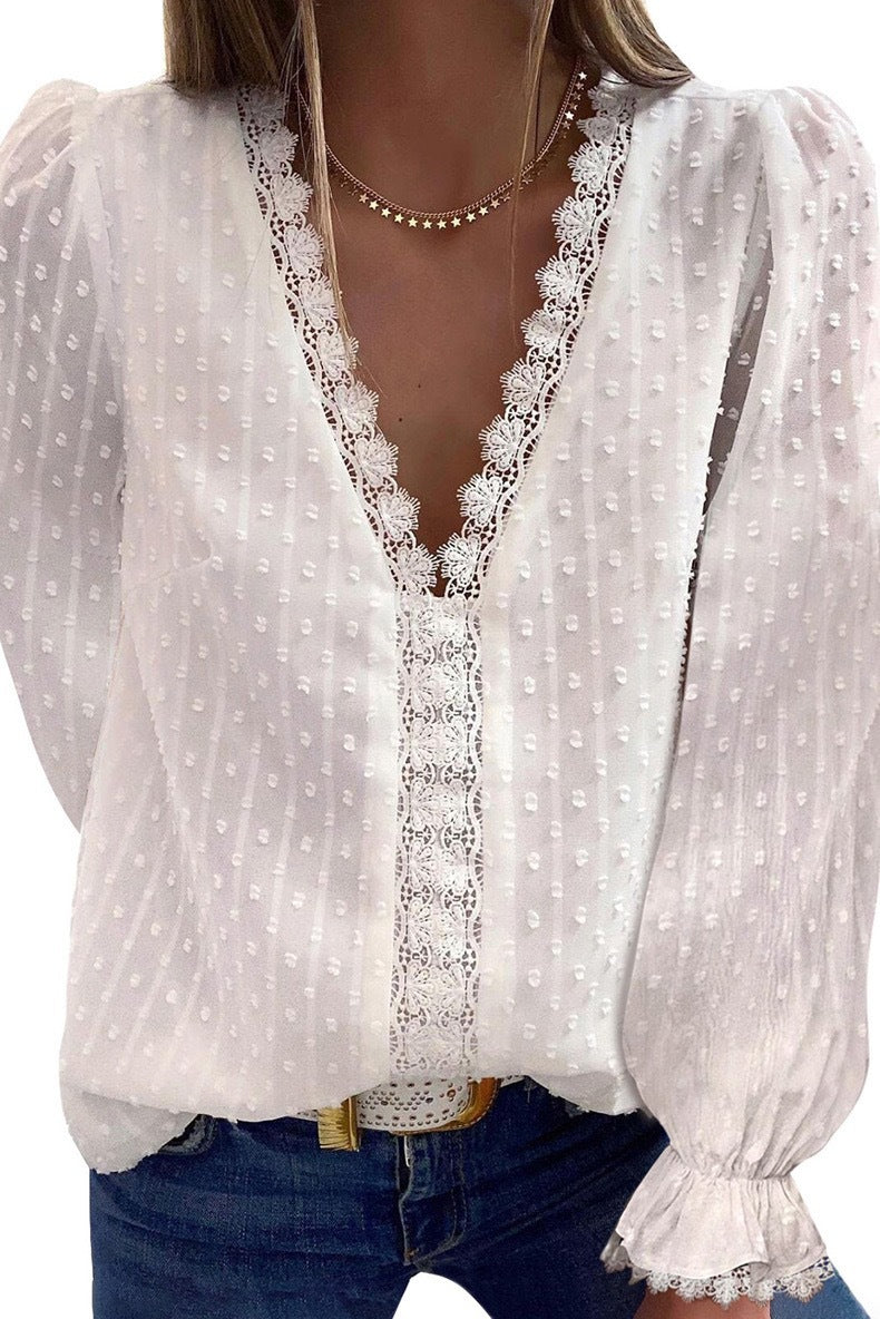 Die weichen Spitzennähte, Pom-Pom-Designs und locker sitzenden Ärmel machen diese langärmelige Spitzen-Pom-Pom-Bluse mit V-Ausschnitt zu einer niedlichen Ergänzung für jeden Kleiderschrank. Es ist in fünf Farben erhältlich.
