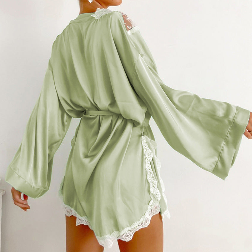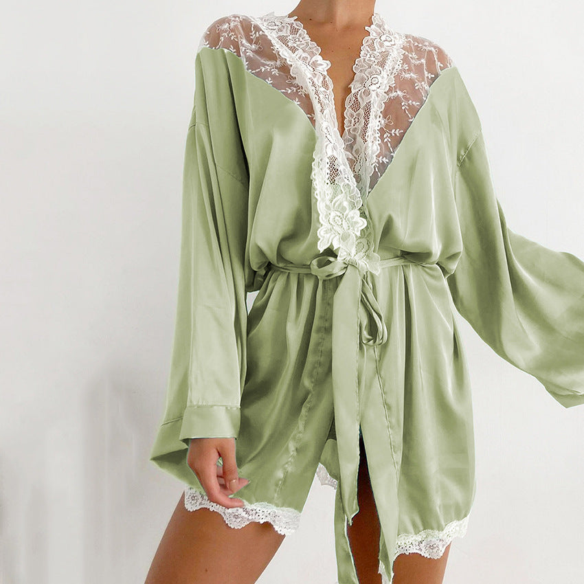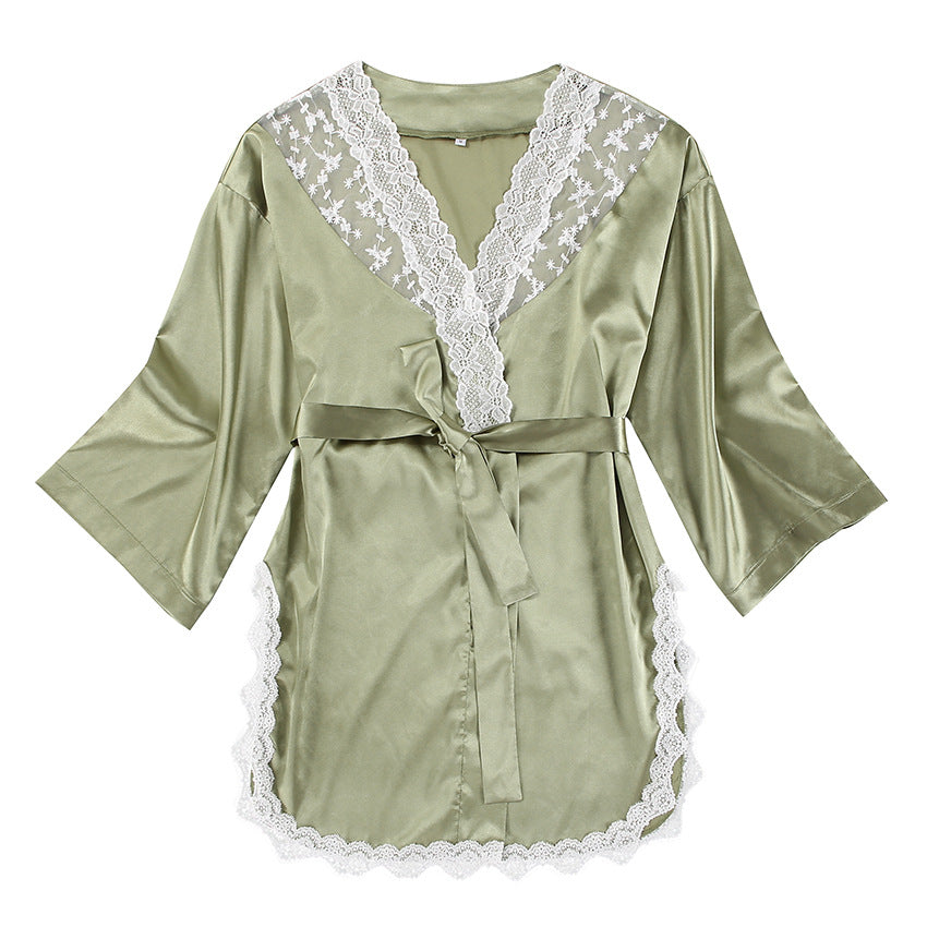 Der Women's Lacy Silky Loose Sleeve Short Robe ist ein verführerischer Bademantel für die Nacht oder den Morgen. Es hat Spitzenfransen entlang des Saums und der Schultern und ist in einem weichen Hellgrün gehalten.