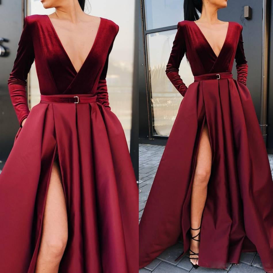 Machen Sie einen großen Eingang mit dem Long Sleeve Ball -Kleid der Frauen mit Knapp Taille. Dieses reichhaltige purpurrote Kleid mit einem niedrigen V-Ausschnitt und einen Oberschenkelschlitz im wogenden Rock.